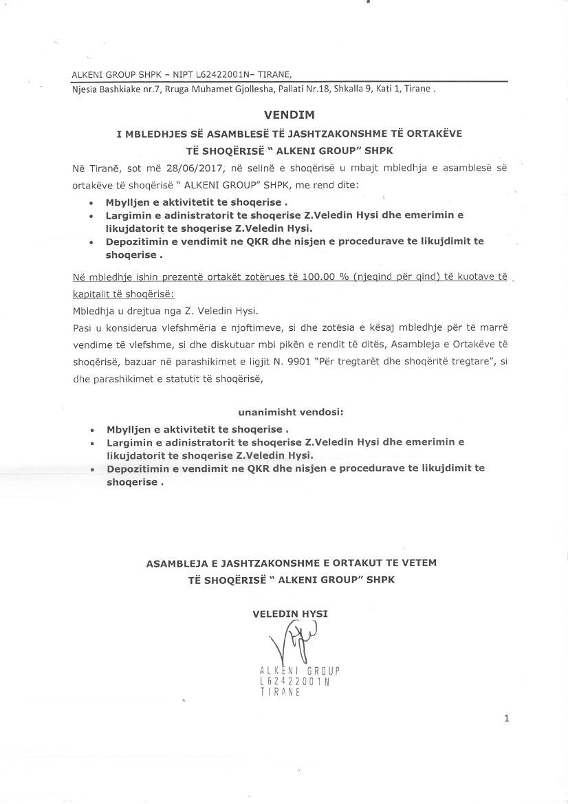 → Ekstrakti Historik i Regjistrit Tregtar date 13.07.2022 → Akt themelimi i Shoqerise → Vendim i Ortakut te Vetem, Likujdim i Shoqerise date 28.06.2017 |