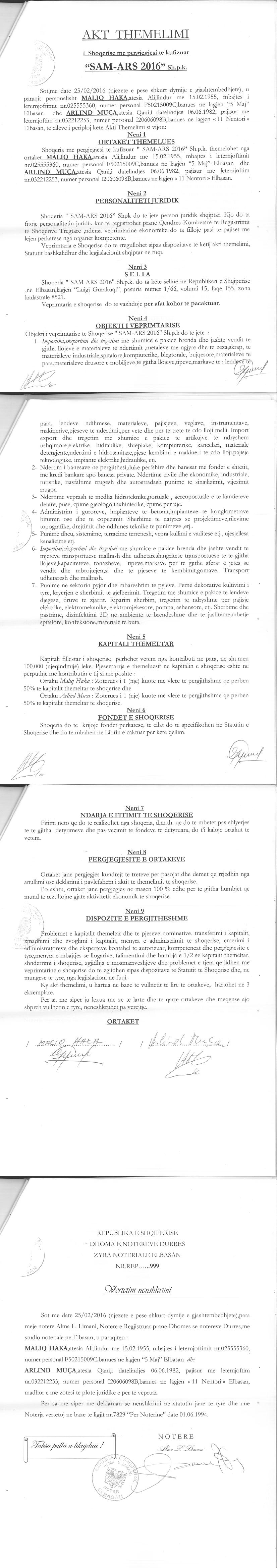 → Ekstrakt historik i regjistrit tregtar 10.07.2021 → Akti i themelimit → Ekstrakt historik i regjistrit tregtar date 08.10.2025 → Lirim nga barra siguruese mbi titujt e pronesise date 23.09.2021 → Kontrate dhurimi kuotash kapitali date 03.05.2023 |