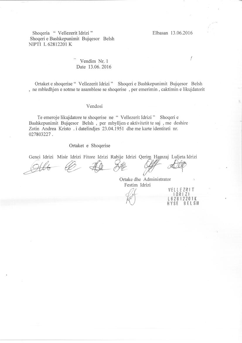 → Ekstrakti Historik i Regjistrit Tregtar date 12.07.2022 → Akt themelimi i Shoqerise → Vendim i Asamblese se Ortakeve, Likuidim i Shoqerise, date 13.06.2016 |