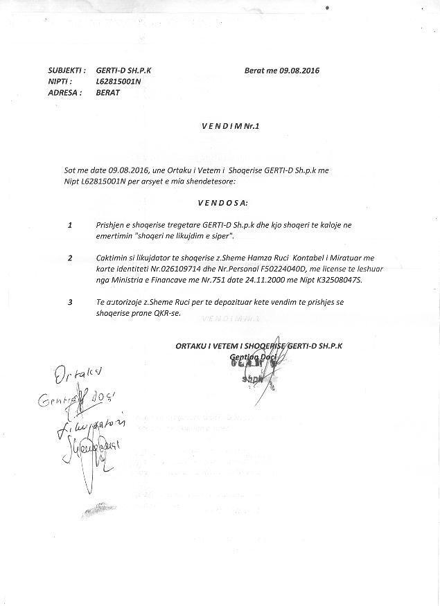 → Ekstrakti Historik i Regjistrit Tregtar date 12.07.2022 → Akt themelimi i Shoqerise → Vendim i Ortakut te Vetem, Likujdim i Shoqerise date 09.08.2016 |