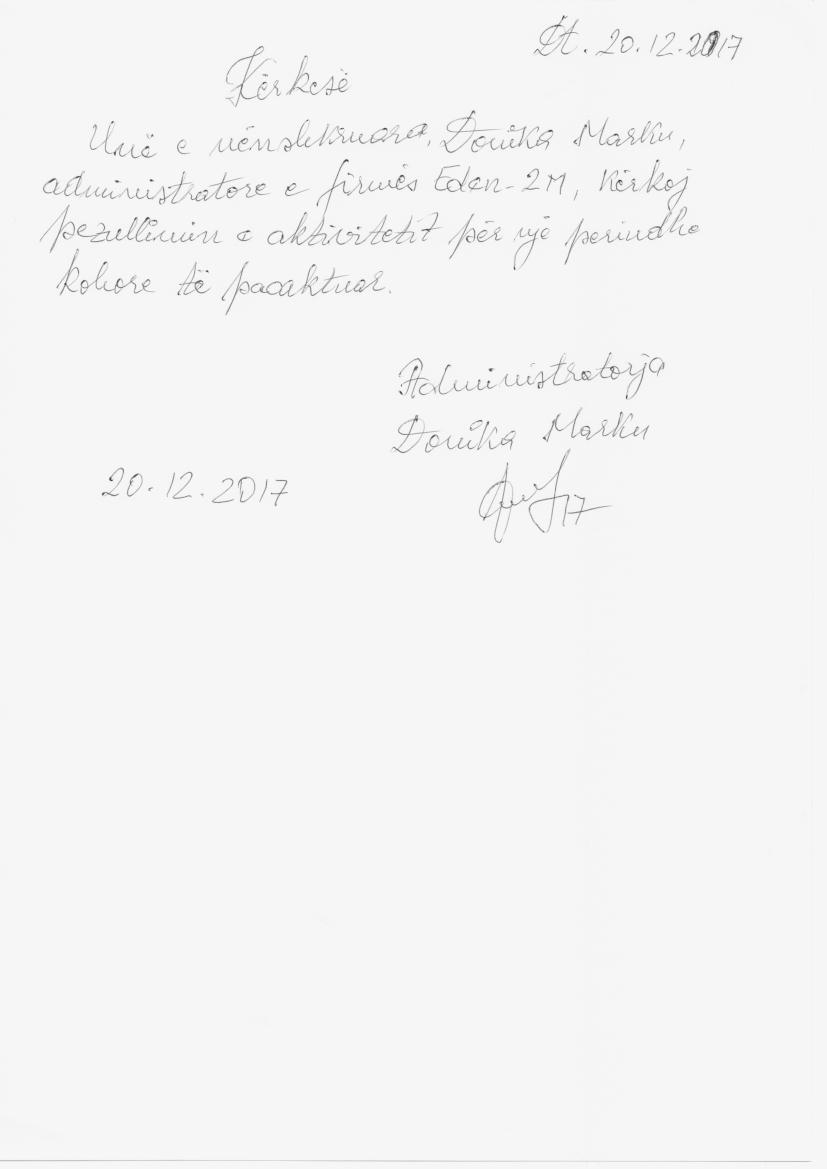 | Çështje Ligjore: | Sipas Vendimit te Ortakut te vetem te shoqerise, date 20.12.2017, eshte vendosur pushimi I perkoheshem I aktivitetit te shoqerise, pa afat. Statusi ishte “Aktiv” u be “Pezulluar” |