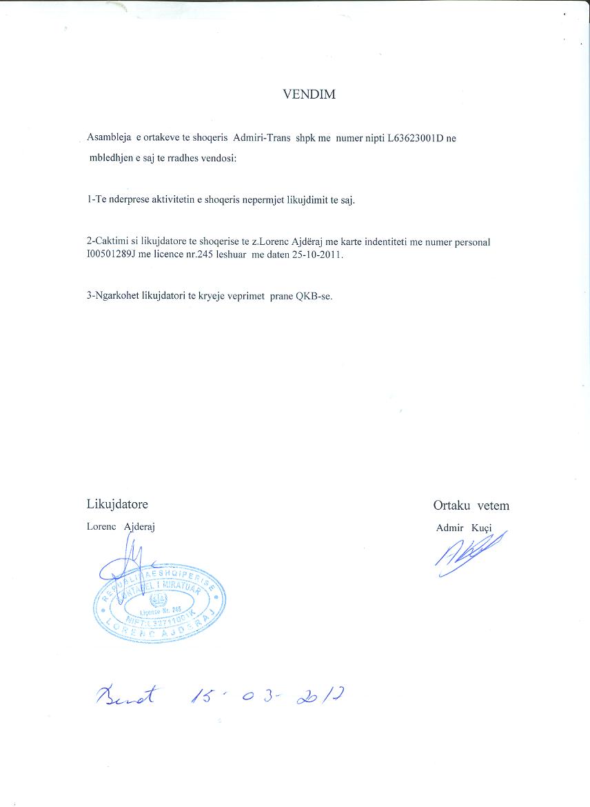 → Ekstrakti Historik i Regjistrit Tregtar date 13.07.2022 → Akt themelimi i Shoqerise → Vendim i Ortakut te Vetem, Likujdim i Shoqerise date 15.03.2017 |
