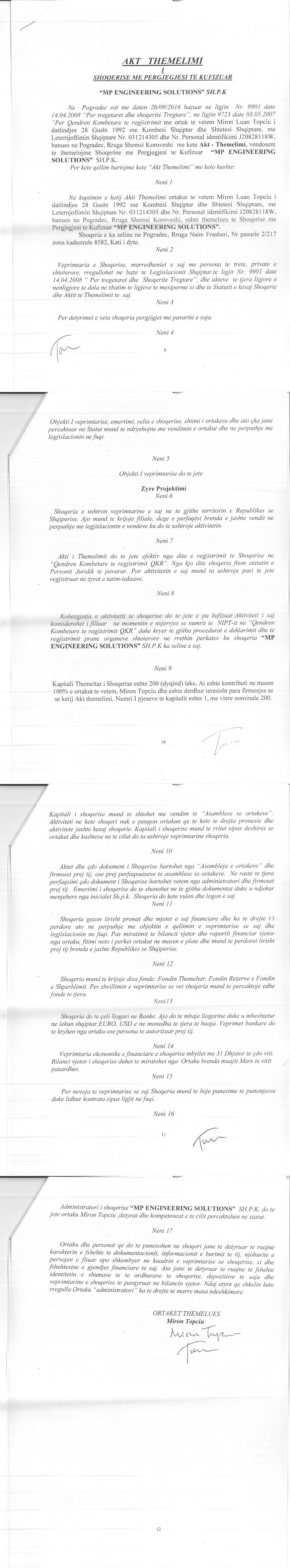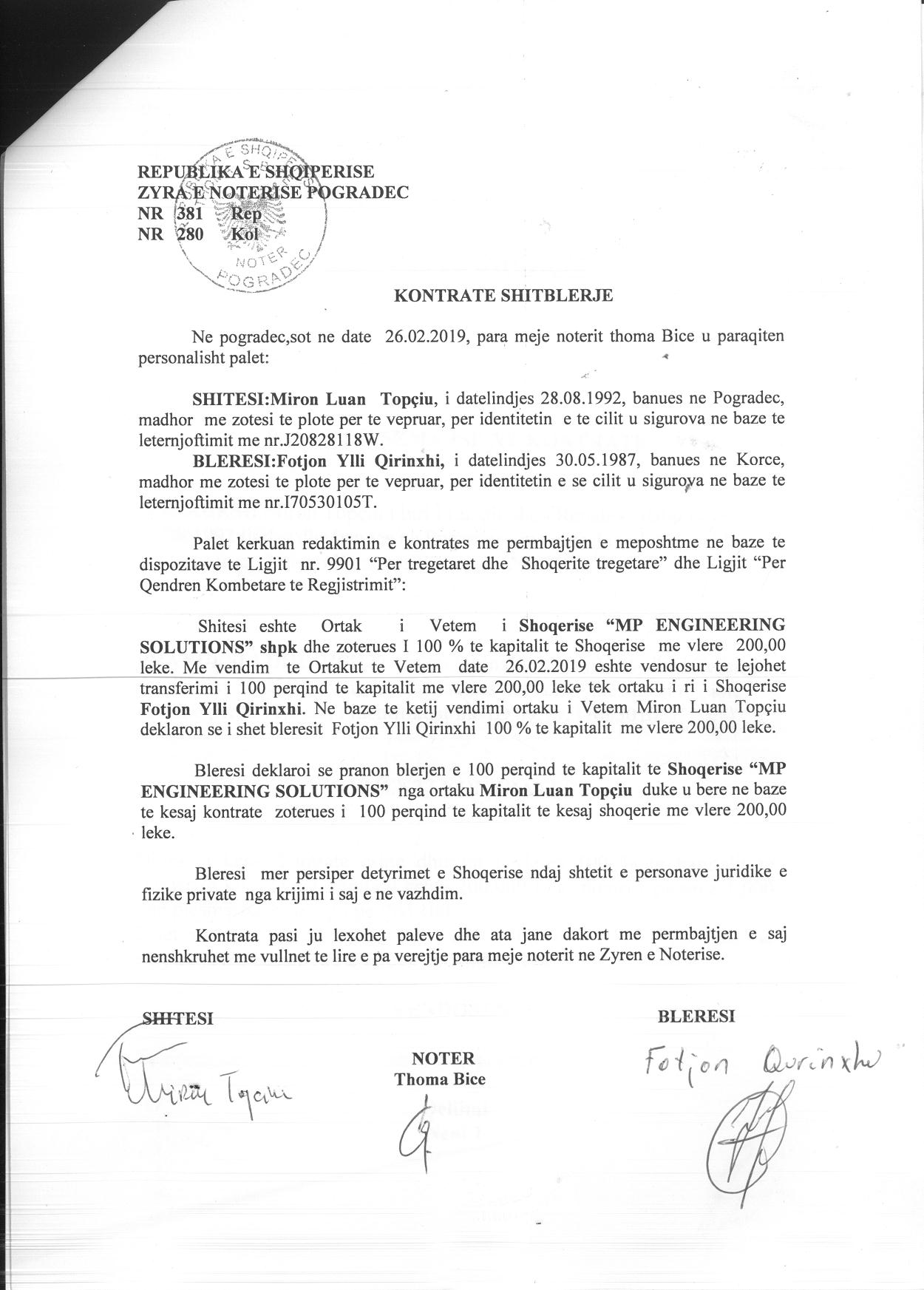 → Ekstrakt historik i regjistrit tregtar date 15.10.2021 → Akti i themelimit → Kontrate shitje kuotash kapitali date 19.11.2019 → Kontrate shitblerje 26.02.2019 |