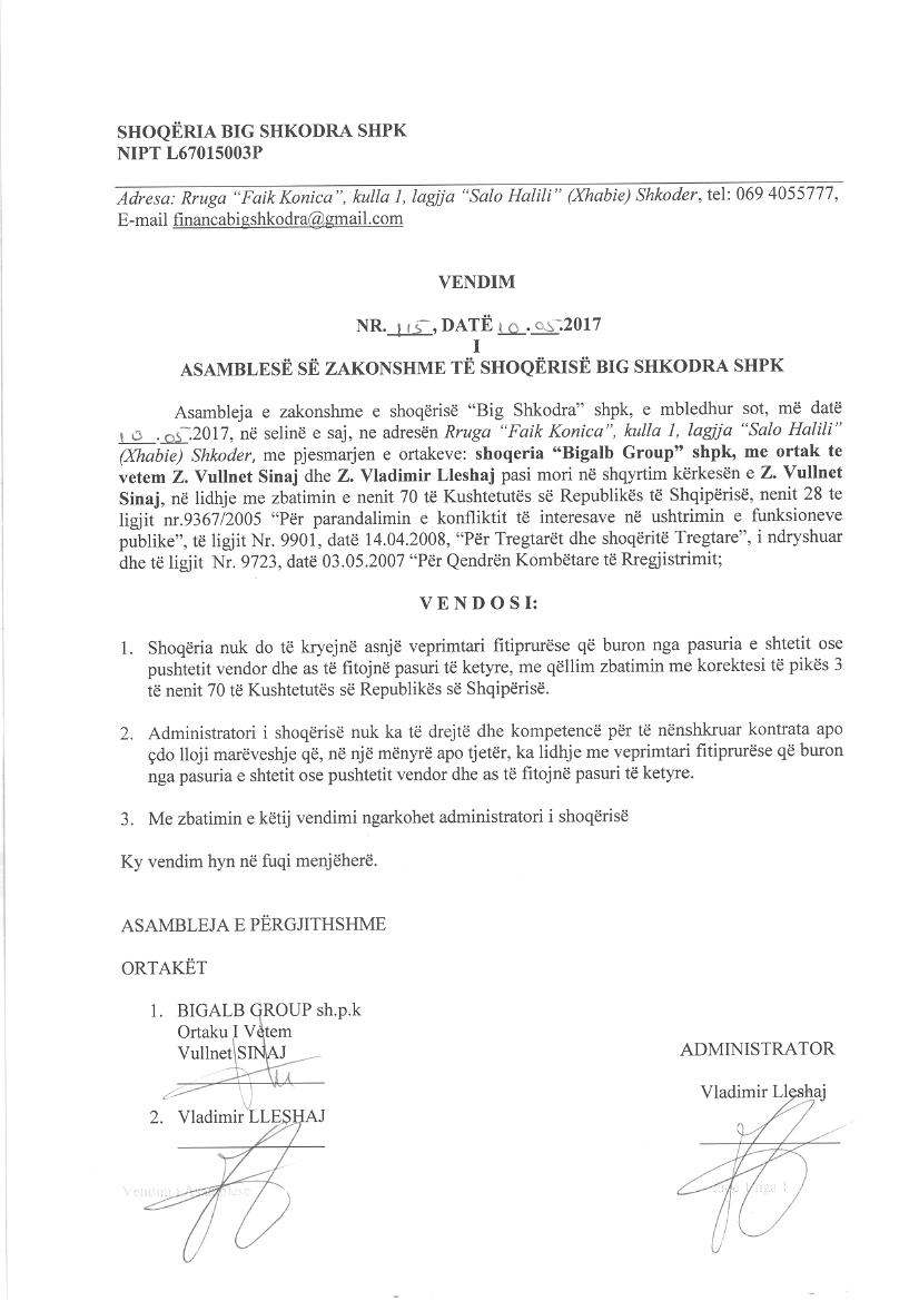 | Shënime: | Kompetencat e Administratorit: Administratori i shoqerise nuk ka ate drejte dhe kompetence per te nenshkruar kontrata apo cdo lloj mareveshje qe ne nje menyre apo tjeter ka lidhje me veprimtari fitimprurese qe buron nga pasuria e shtetit ose pushtetit vendor dhe as te fitojne pasuri te ketyre. |
