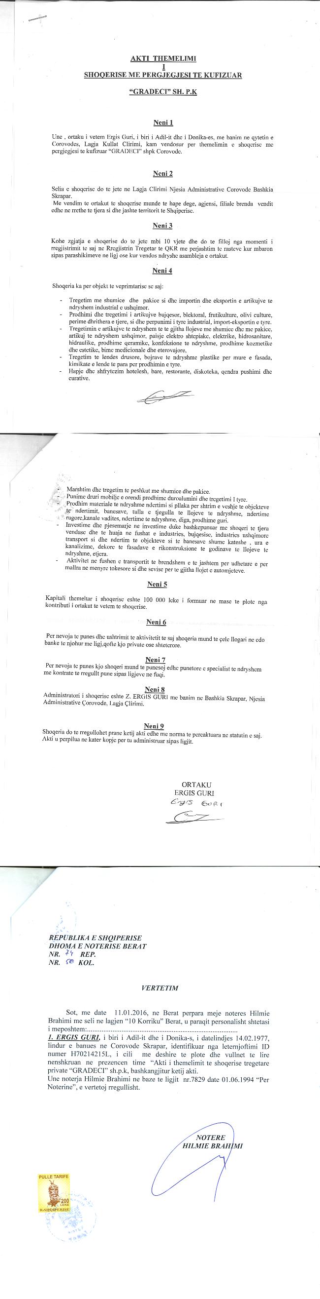 | Çështje Ligjore: | Me date 25.01.2017, me ane te Prokures se Posaçme Nr.57 Rep., Nr. 44 Kol, nepermjet se ciles Shoqeria GRADECI sh.p.k., perfaqesuar nga Administratori Z. Ergis Guri i jep kompetence Z.Adil Guri qe ta perfaqesoje ne baze te tagrave qe i lejon kjo prokure. |
