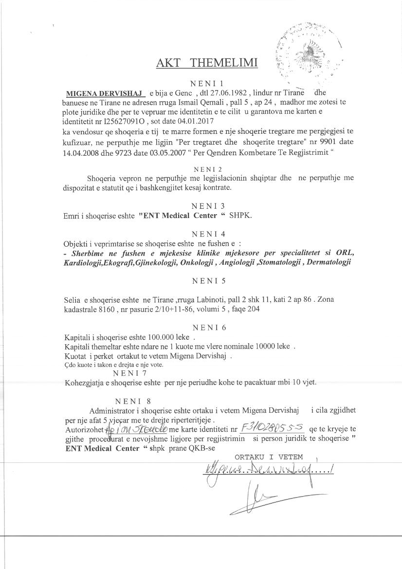 | Objekti i Veprimtarisë: | Sherbime ne fushen e mjekesise klinike mjekesore per specialitetet si ORL, Kardiologji, Ekografi, Gjinekjlogji, Onkologji, Angiologji, Stomatologji, Dermatologji. |