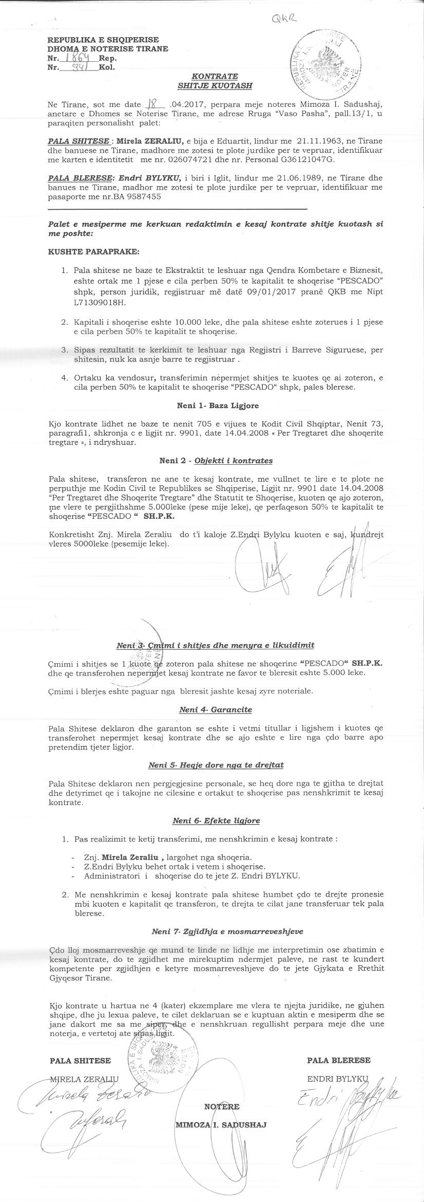 → Ekstrakti Historik i Regjistrit Tregtar date 04.01.2023 → Akt themelimi i Shoqerise → Kontrate Shitje Kuotash date 18.04.2017 |