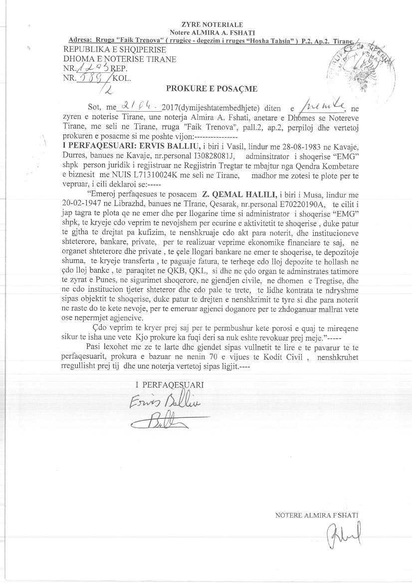 | Çështje Ligjore: | I. Me date 28/04/2017, me ane te Prokures se Posacme, nr.1203 rep., nr. 588/2 kol., date 21.04.2017 leshuar nga Ervis Balliu I cili emeron si perfaqesues te posacem Qemal Halili me tagra perfaqesimi sipas kesaj procure. II. Me date 24.02.2022, me kerkese te administratorit dhe ortakut te vetem, u kerkua: Pushim i Përkohshëm i Aktivitetit. Statusi i Shoqerise kalon nga "Aktiv" ne "Pezulluar" |