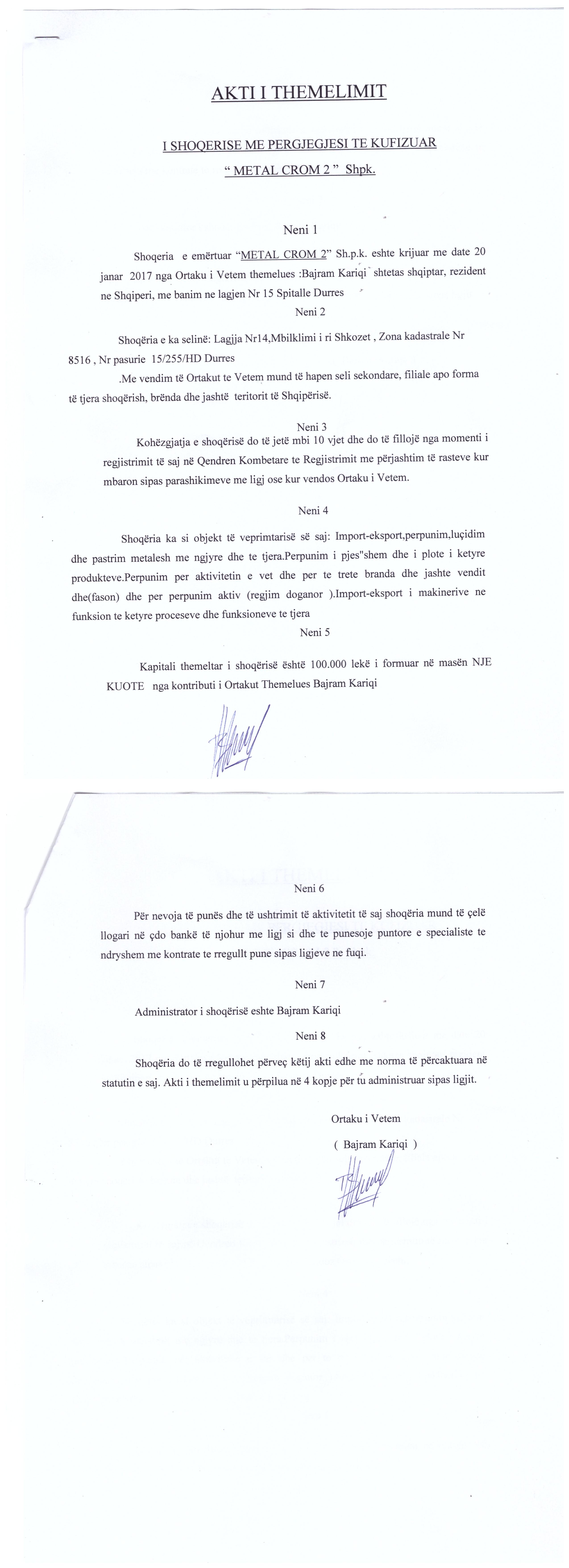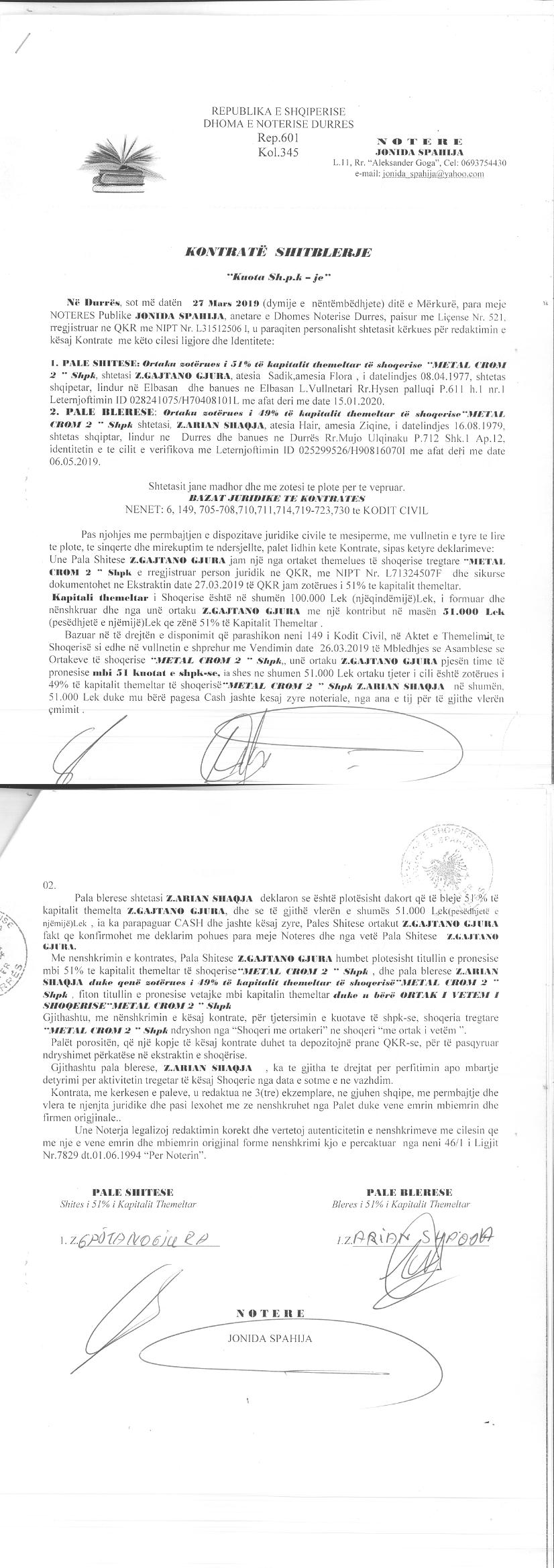 | Çështje Ligjore: | Me date 09/01/2023, me ane te Urdhërit Nr.130754 Prot., datë 28.12.2022, protokolluar nga QKB me NR. 62 Prot datë 04.01.2023, lëshuar nga Permbarues Gjyqesor Privat Enuar V MERKO E.G Bailiff’s Service, u urdherua vendosja e sekuestros konservative mbi të gjitha aksionet e zotëruara nga pala debitore Shoqëria “ METAL Crom 2” shpk me NIPT L71324507F. Kreditor: Dega e Doganes Durres; Objekt: Detyrim doganor |