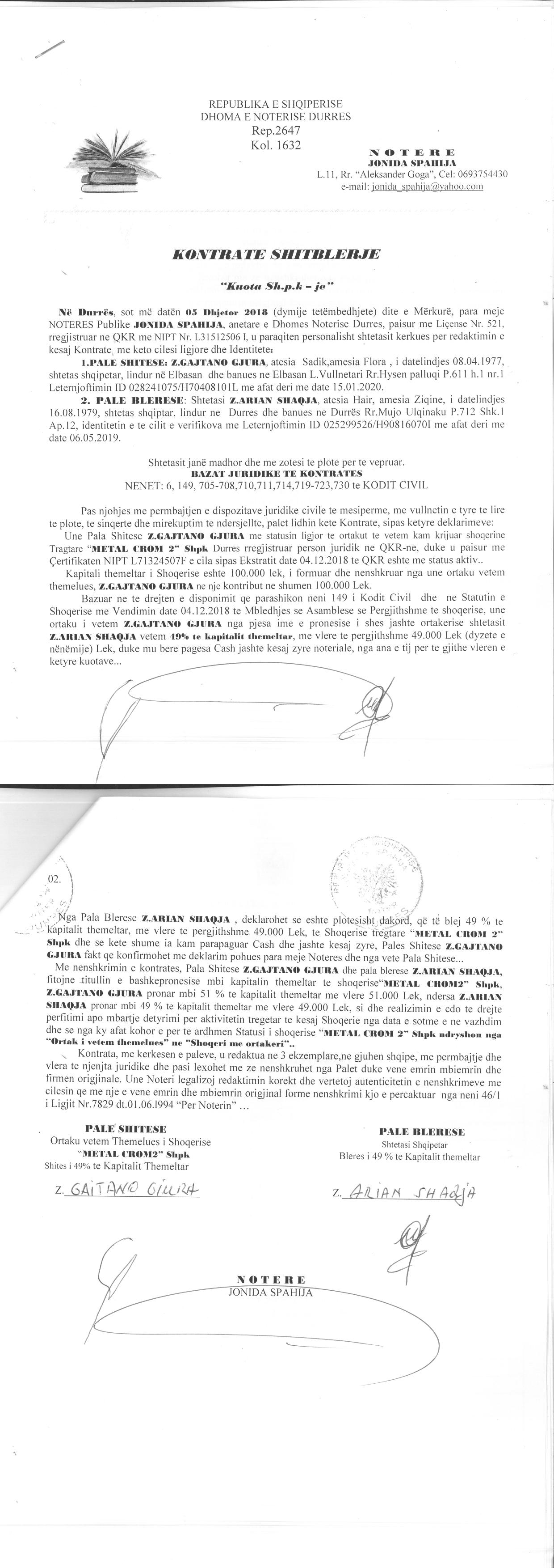 → Ekstrakti Historik i Regjistrit Tregtar date 10.01.2023 → Akt themelimi i Shoqerise → Kontrate Shitje Kuotash date 19.10.2018 → Kontrate Shitblerje Kuotash date 05.12.2018 → Kontrate Shitblerje Kuotash date 27.03.2019 → Urdher per Venie Sekuestro date 28.12.2022 |