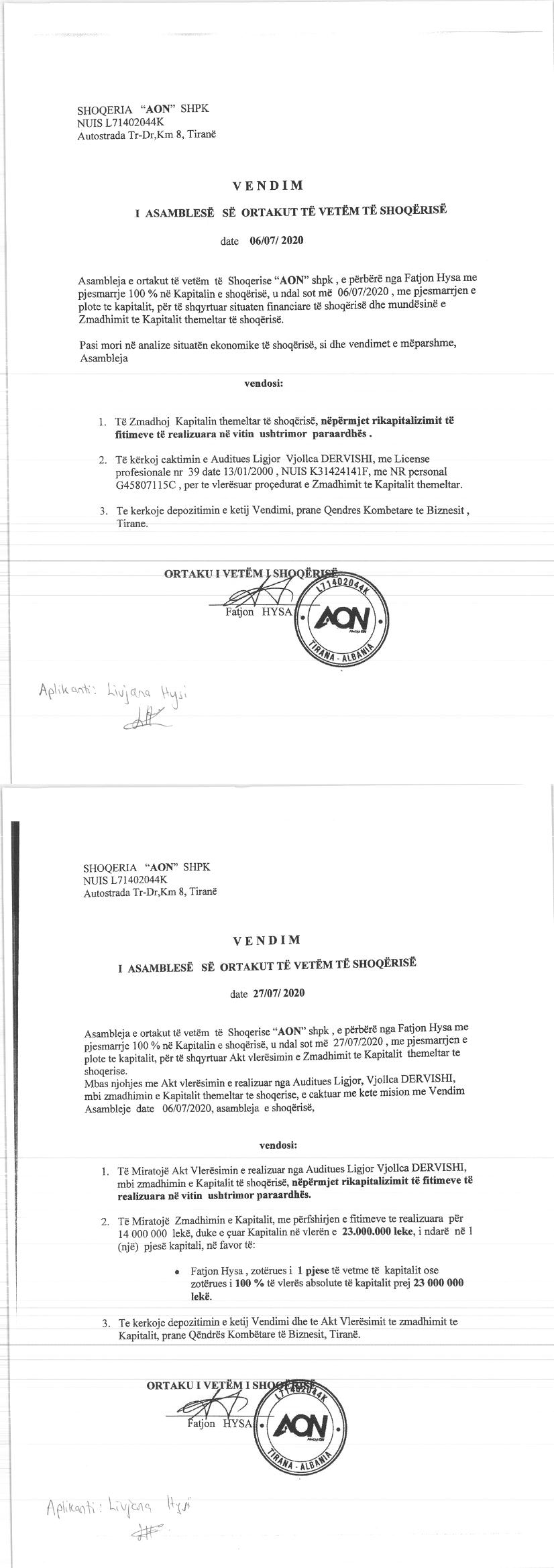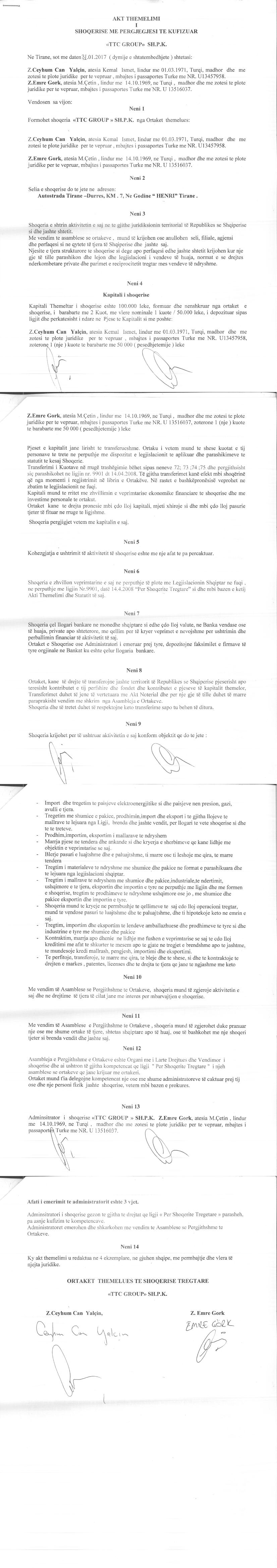 → Ekstrakti Historik i Regjistrit Tregtar date 17.01.2023 → Akt themelimi i Shoqerise → Kontrate Shitblerje Kuotash date 19.04.2017 → Kontrate Shitje Kuotash date 01.02.2018 → Kontrate Shitje Kuotash date 09.08.2018 → Vendim i Ortakut te Vetem, Zmadhim Kapitali date 04.07.2019 → Vendim i Ortakut te Vetem, Zmadhim Kapitali date 27.07.2020 |