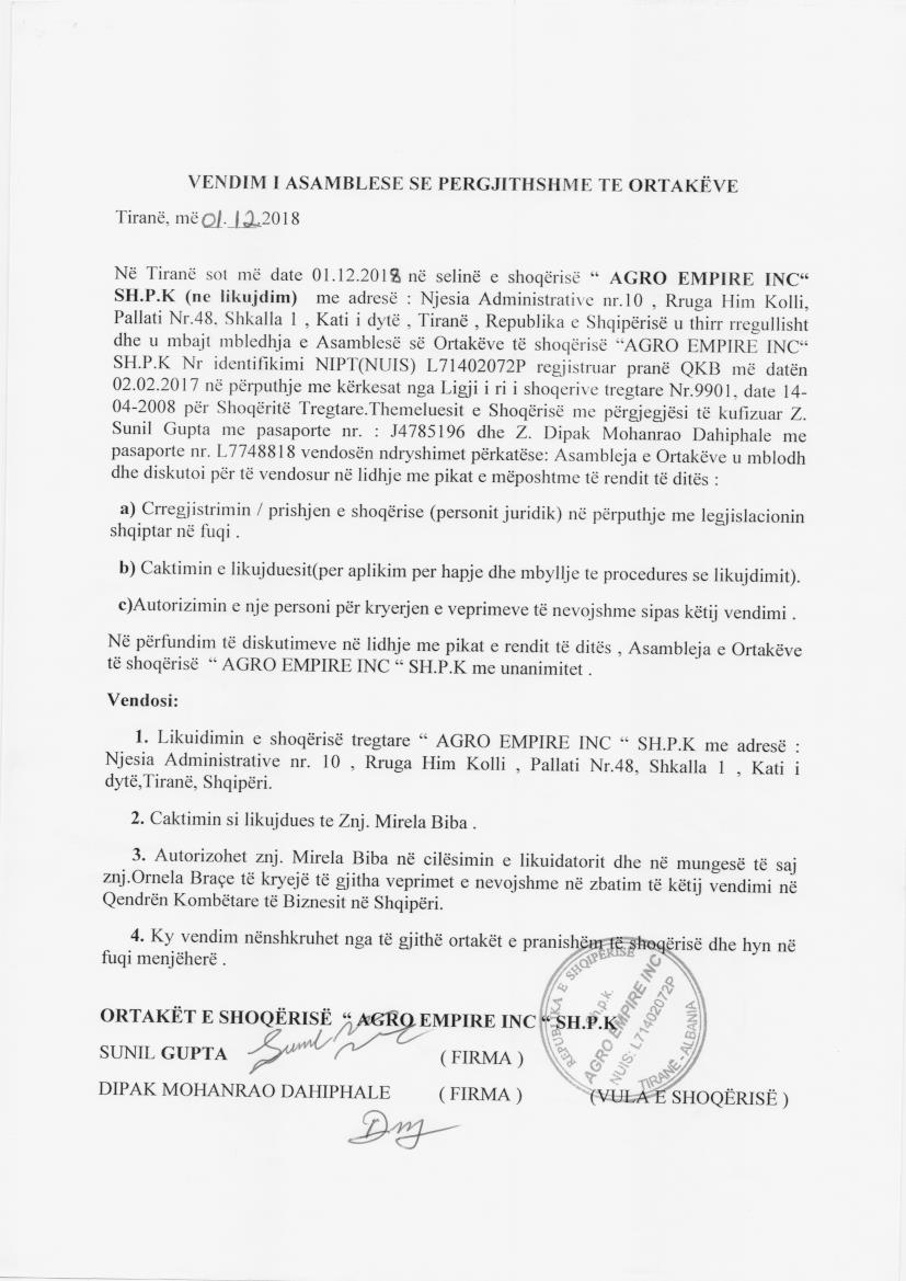 | Çështje Ligjore: | I. Me date 01.12.2018, me vendim te asamblese se ortakeve, u vendos: Fillimi i Procedures se Likuidimit te Shoqerise. Statusi i Shoqerise kalon nga "Aktiv" ne "Shoqeri ne Likuidim e Siper" II. Me date 18.08.2022, me vendim te asamblese se ortakeve, u vendos: Cregjistrim i Shoqerise. Statusi i Shoqerise kalon nga "Shoqeri ne Likuidim e Siper" ne "Çregjistruar" |