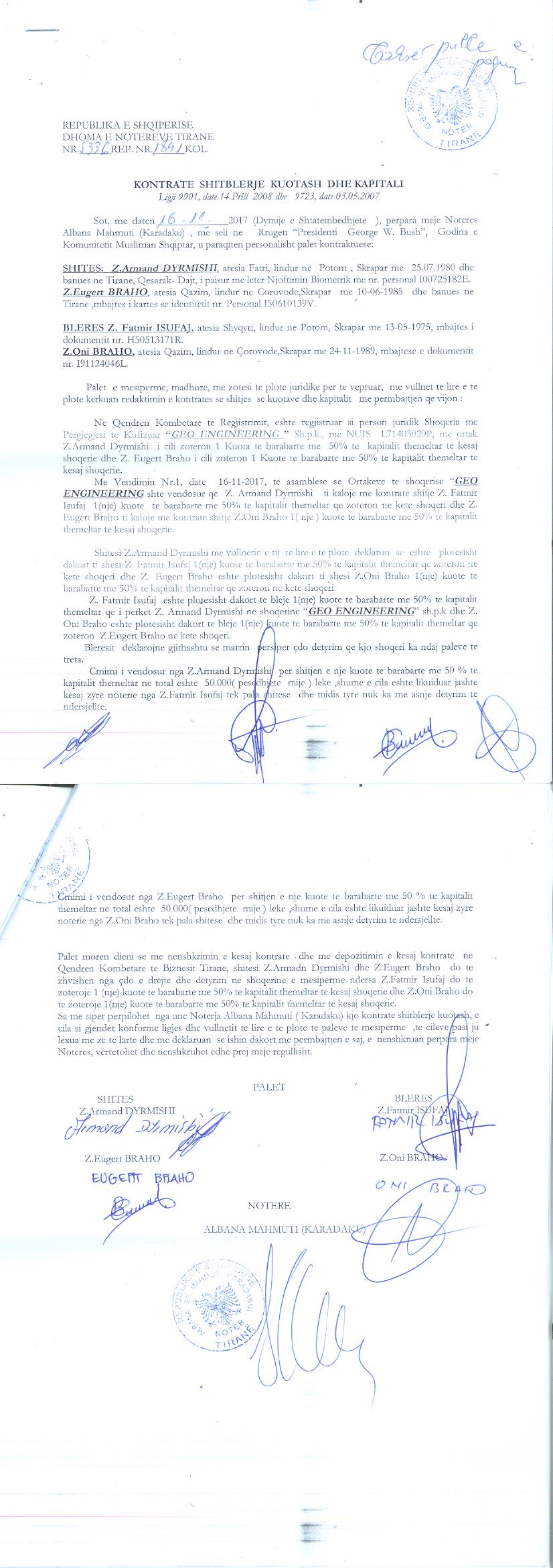 → Ekstrakt historik i regjistrit tregtar date 07.01.2022 → Akti i themelimit → Kontrate shitblerje kuotash dhe kapitali date 16.11.2017 → Kontrate shitje kuotash date 29.10.2019 |