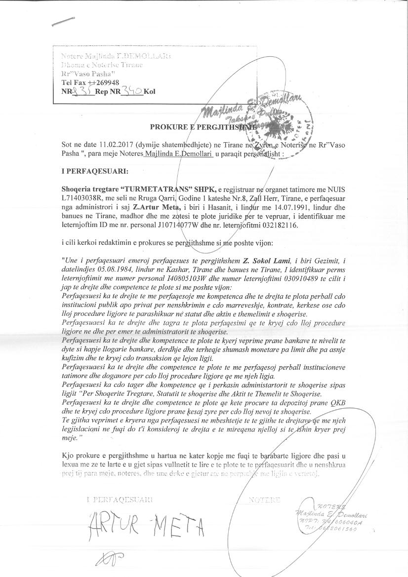 → Ekstrakti Historik i Regjistrit Tregtar date 16.01.2023 → Akt themelimi dhe Statuti i Shoqerise → Prokure e Pergjithshme date 11.02.2017 |
