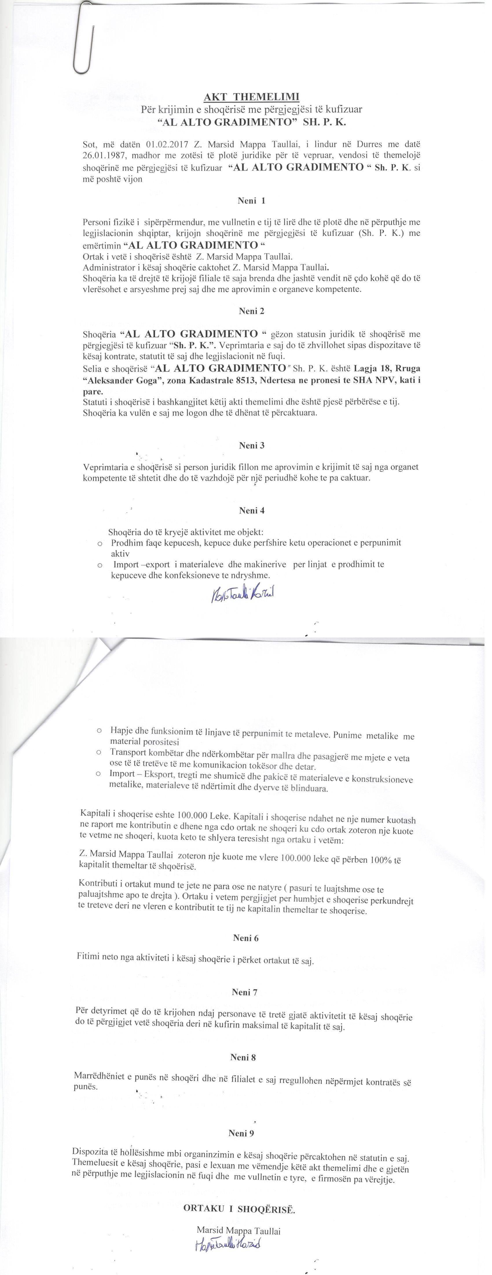 → Ekstrakti Historik i Regjistrit Tregtar date 27.12.2019 → Akt themelimi i Shoqerise → Kerkese e administratorit per ndryshimin e te dhenave personale → VKM nr. 54, datë 05.02.2014, Për përcaktimin e kritereve, të procedurës e të mënyrës së dhënies me qira, enfiteozë apo kontratave të tjera të pasurisë shtetërore → Ekstrakti Historik i Regjistrit Tregtar date 17.01.2023 → Ekstrakt Historik i Regjistrit Tregtar date 11.12.2023 |