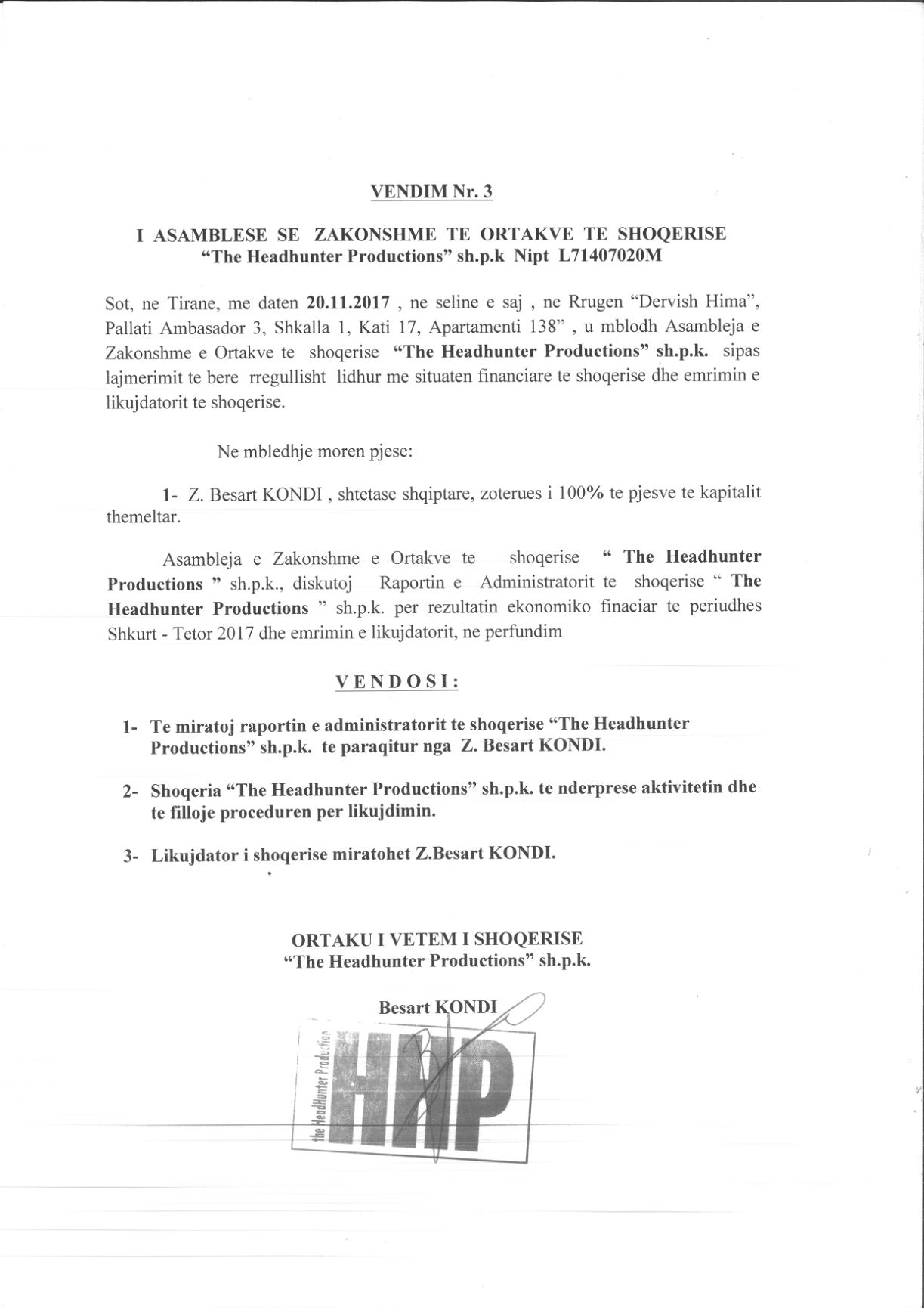 | Administrator: | Besart Kondi (Likuidues) |