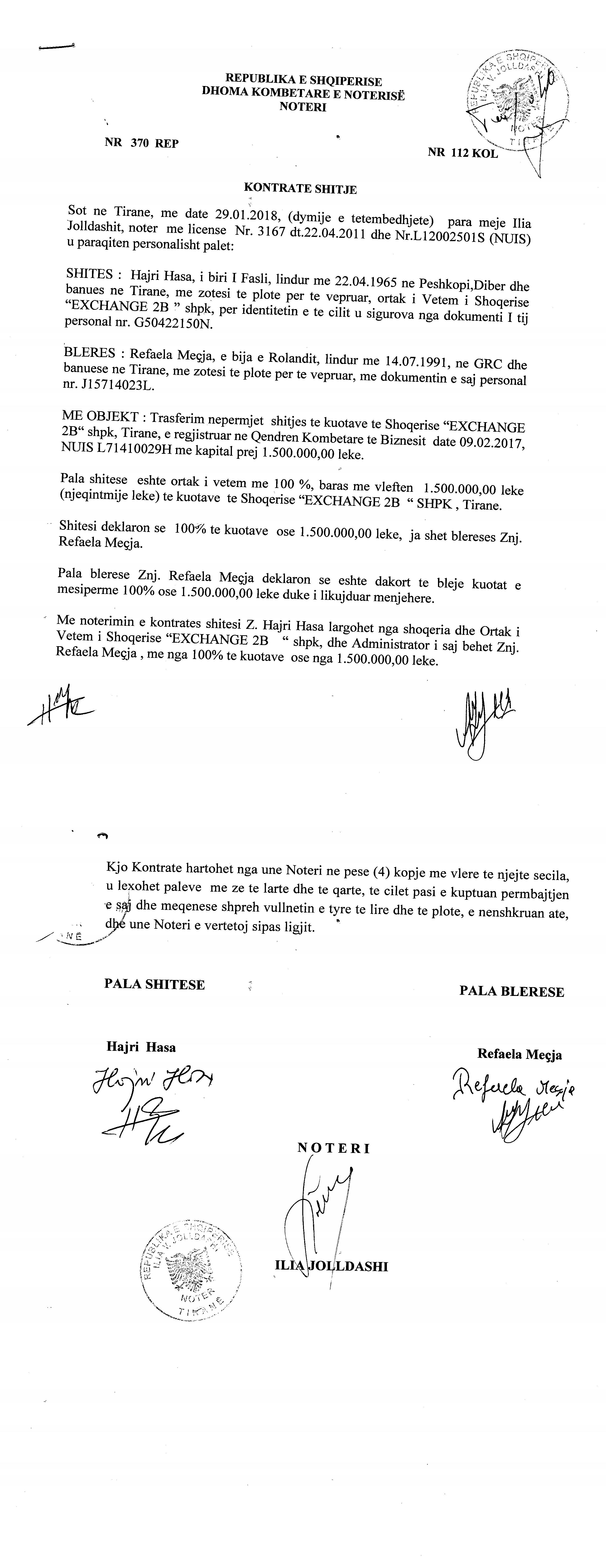 → Ekstrakti Historik i Regjistrit Tregtar date 20.01.2023 → Statuti i Shoqerise → Kontrate Shitje Kuotash date 29.01.2018 → Kontrate Shitblerje Kuotash date 15.05.2018 |