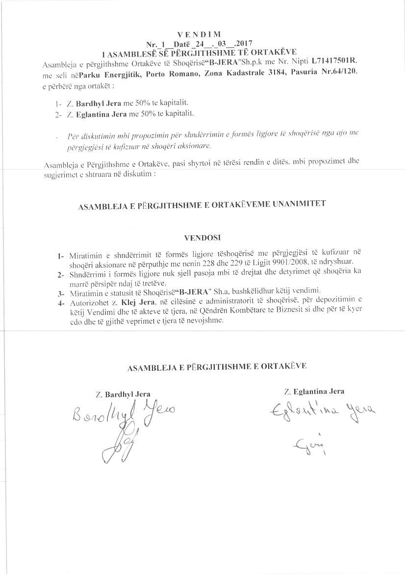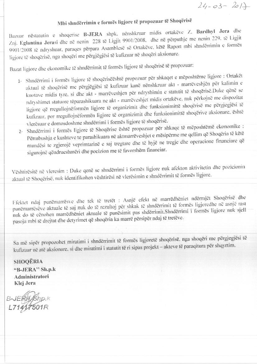 → Ekstrakt Historik i Regjistrit Tregtar, date 26.01.2023 → Akt themelimi dhe Statuti i Shoqerise me Pergjegjesi te Kufizuar → Raport Propozimi per Shnderrimin e Formes Ligjore → Vendim i Asamblese se Ortakeve, Shnderrimi i Formes Ligjore date 24.03.2017 → Urdhër për Vënien e Sekuestros, date 05.05.2021 → Vendim per Pushimin e "Urdherit te Ekzekutimit", date 15.06.2021 |