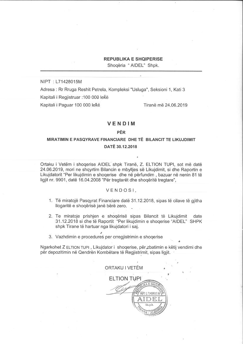 | Çështje Ligjore: | I. Me date 29.05.2018, me vendim te ortakut te vetem, u vendos: Kalimi i Shoqerise ne Likuidim. Statusi i Shoqerise kalon nga "Aktiv" ne "Shoqeri ne Likuidim e Siper" II. Me date 24.06.2019, me vendim te ortakut te vetem, u vendos: Cregjistrim i Shoqerise. Statusi i Shoqerise kalon nga "Shoqeri ne Likuidim e Siper" ne "Çregjistruar" |