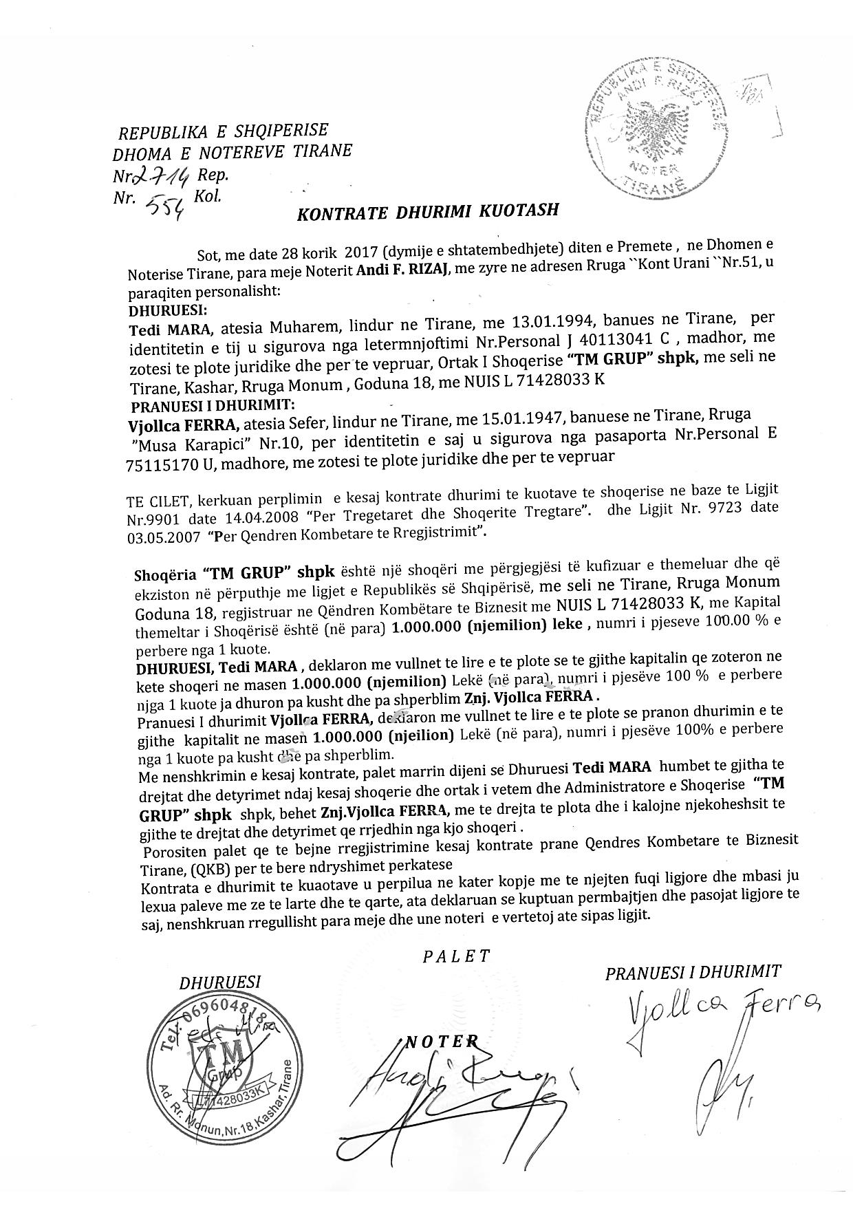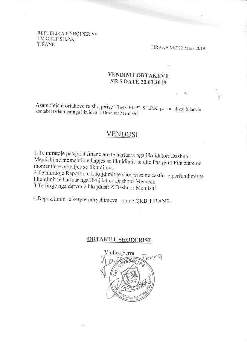 → Ekstrakt Historik i Regjistrit Tregtar date 12.05.2023 → Akt themelimi i Shoqerise → Kontrate Dhurimi Kuotash date 28.07.2017 → Vendim i Ortakut te Vetem, Likuidimi i Shoqerise date 14.11.2017 → Vendim i Ortakut te Vetem, Cregjistrim i Shoqerise date 22.03.2019 |