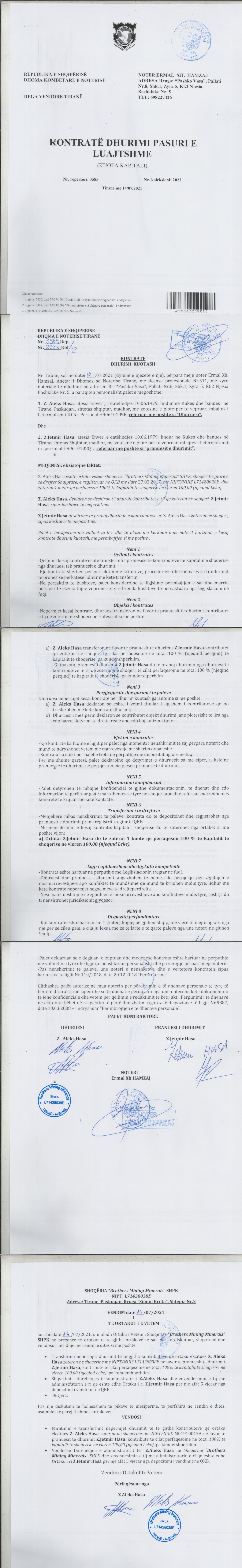 → Ekstrakt Historik i Regjistrit Tregtar date 12.05.2023 → Akt themelimi dhe Statuti i Shoqerise → Kontrate Shitje Kuotash date 26.10.2017 → Vendim i Asamblese se Ortakeve, Miratim Shitje Kuotash date 26.07.2019 → Kontrate Shitje Kuotash date 16.11.2020 → Kontrate Dhurimi Kuotash date 14.07.2021 → Kontrate Shitje Kuotash date 19.11.2021 |