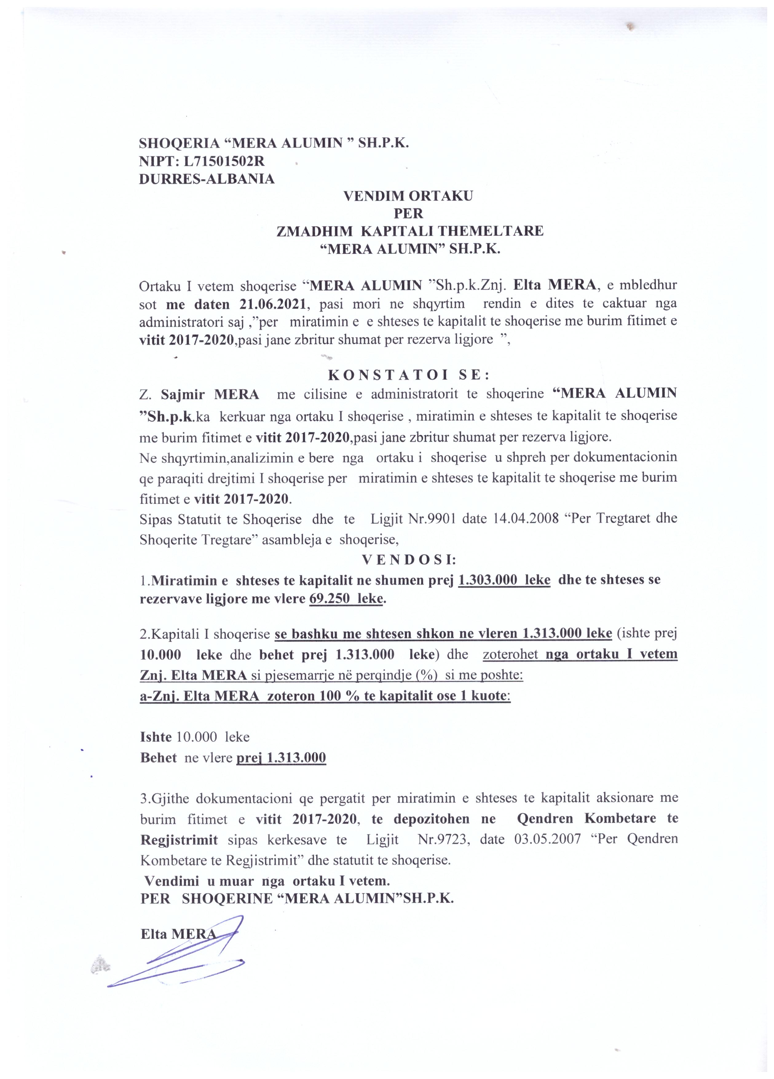 → Ekstrakt Historik i Regjistrit Tregtar date 12.05.2023 → Akt themelimi i Shoqerise → Vendim i Ortakut te Vetem, Zmadhim Kapitali date 21.06.2021 |