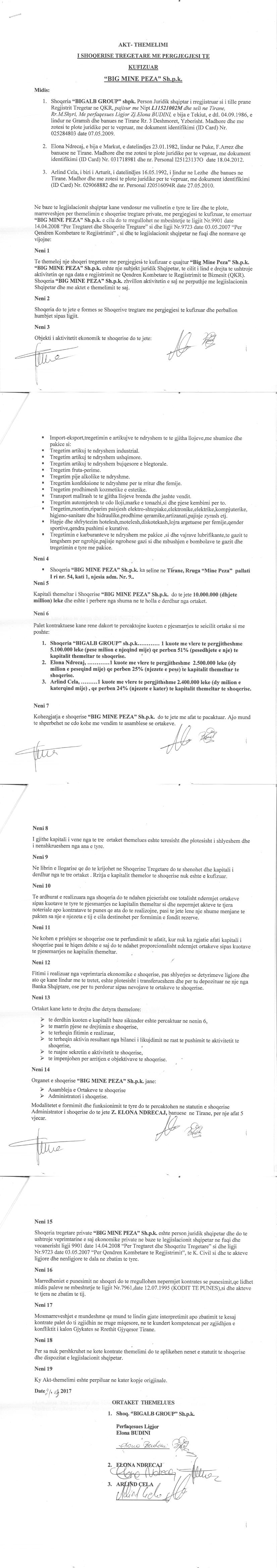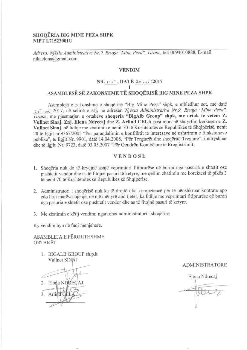 | Shënime: | Kompetencat e Administratorit: Administratori i shoqerise nuk ka te drejte dhe kompetence per te nenshkruar kontrata apo cdo lloj mareveshje qe ne nje menyre apo tjeter, ka lidhje me veprimtari fitimprurese qe buron nga pasuria e shtetit ose pushtetit vendor dhe as te fitoje pasuri te ketyre. |