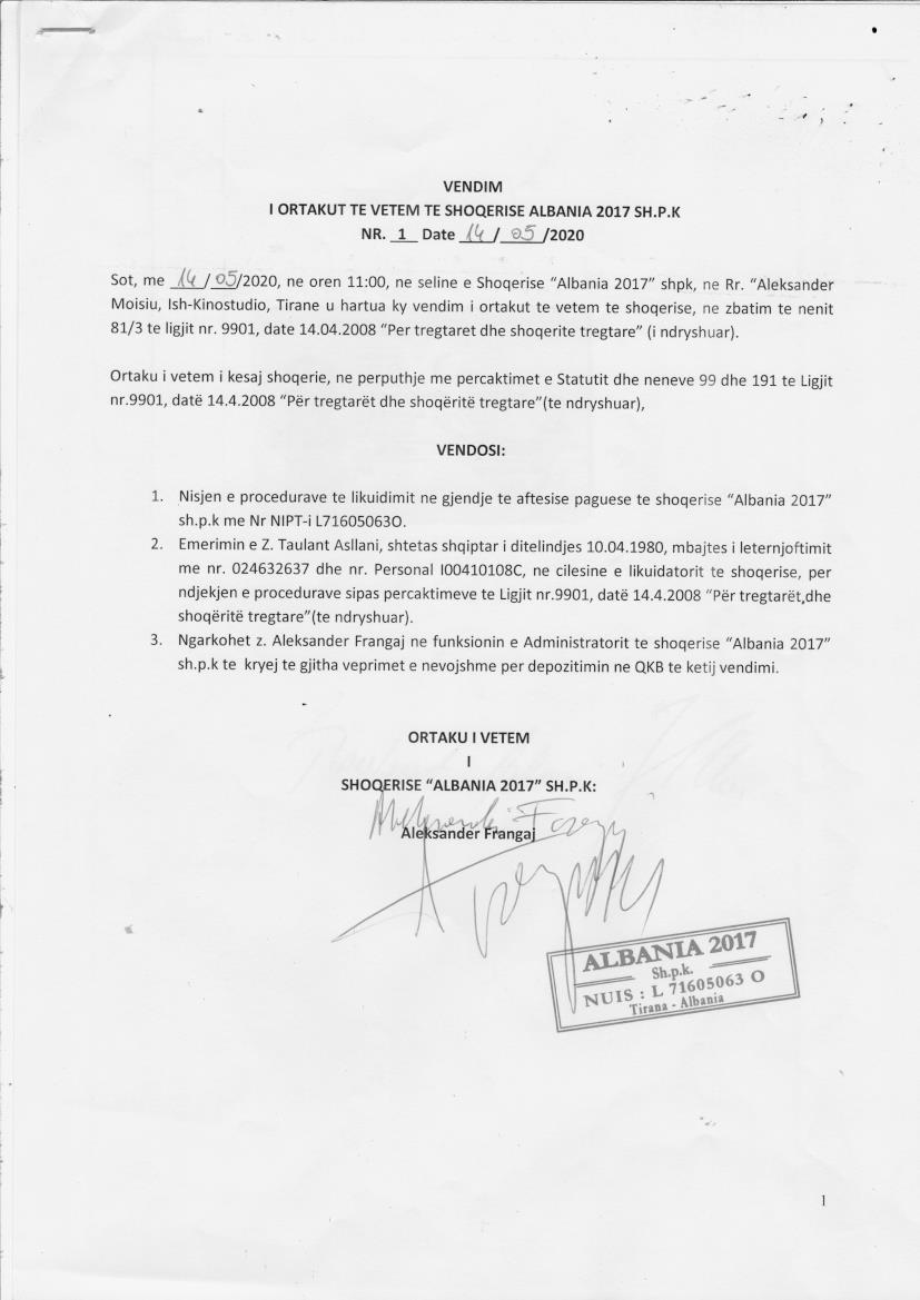 → Ekstrakt Historik i Regjistrit Tregtar date 21.03.2023 → Akt themelimi dhe Statuti i Shoqerise → Vendim i Ortakut të Vetëm, Likuidim Shoqerie datë 14.05.2020 → Raport Likuidimi i Shoqërisë → Vendim i Ortakut të Vetëm, Çregjistrim Shoqerie datë 10.08.2020 |