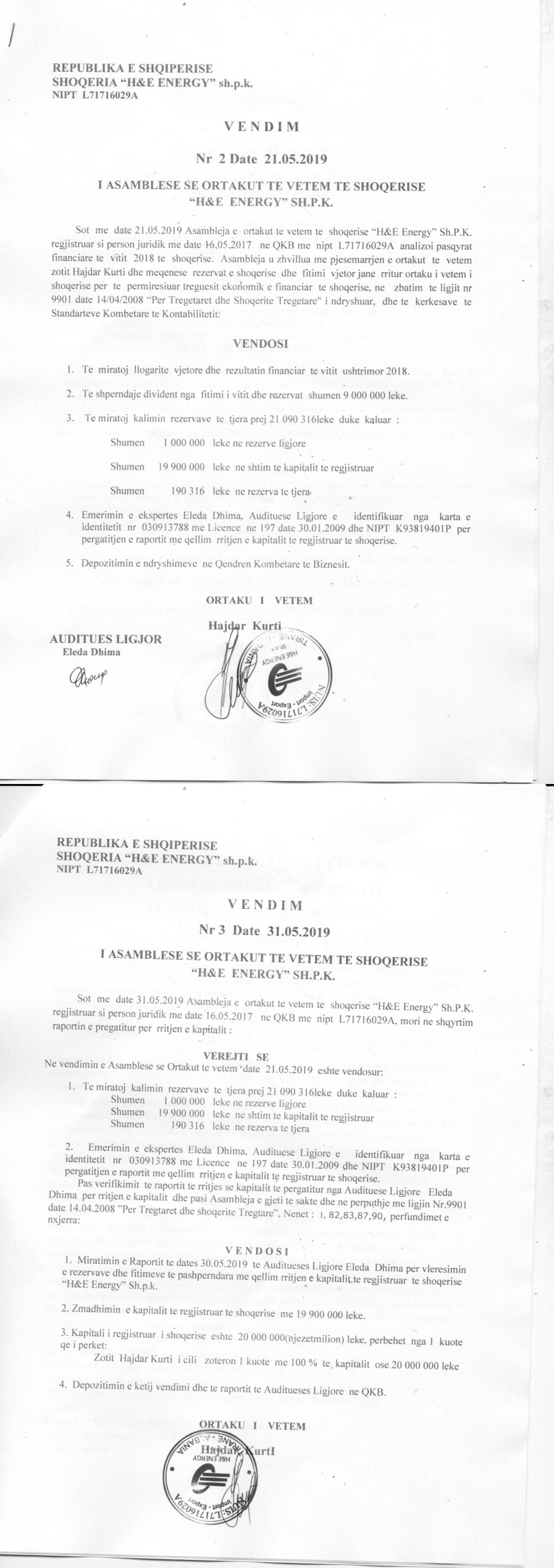 → Ekstrakt historik i regjistrit tregtar 12.02.2021 → Vendimi i asamblese se ortakut te vetem per zmadhimin e kapitalit 21.05.2019 |