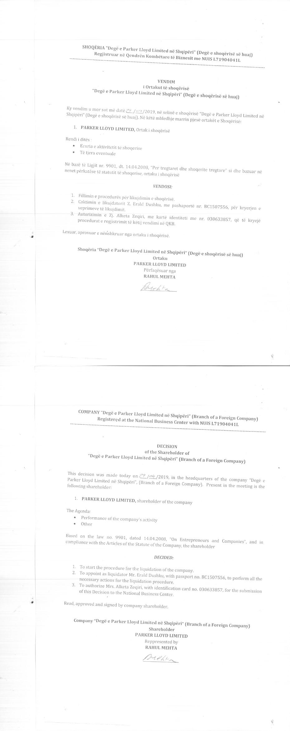 | Emërtime të tjera Tregtare: | Degë e Parker Lloyd Limited në Shqipëri |