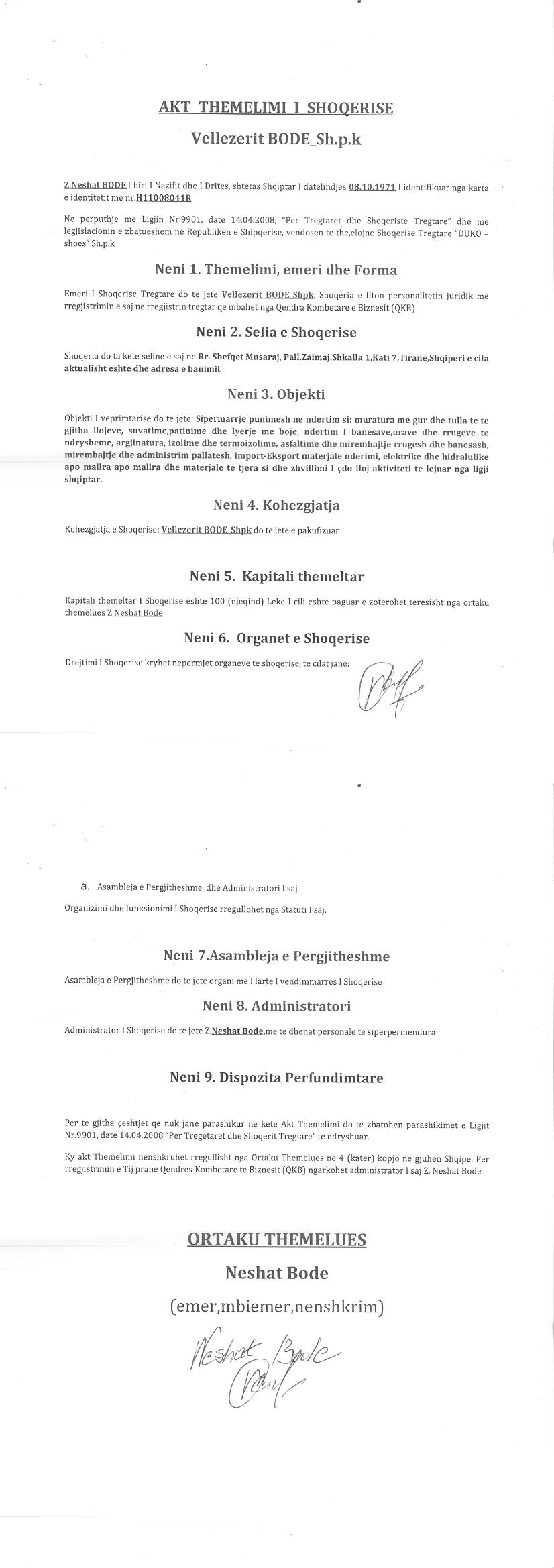tatimpaguesit “Vellezerit BODE” sh.p.k, pajisur me NUIS (NIPT L71906018K, duke