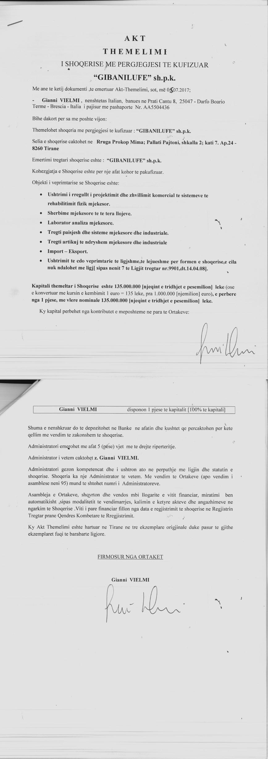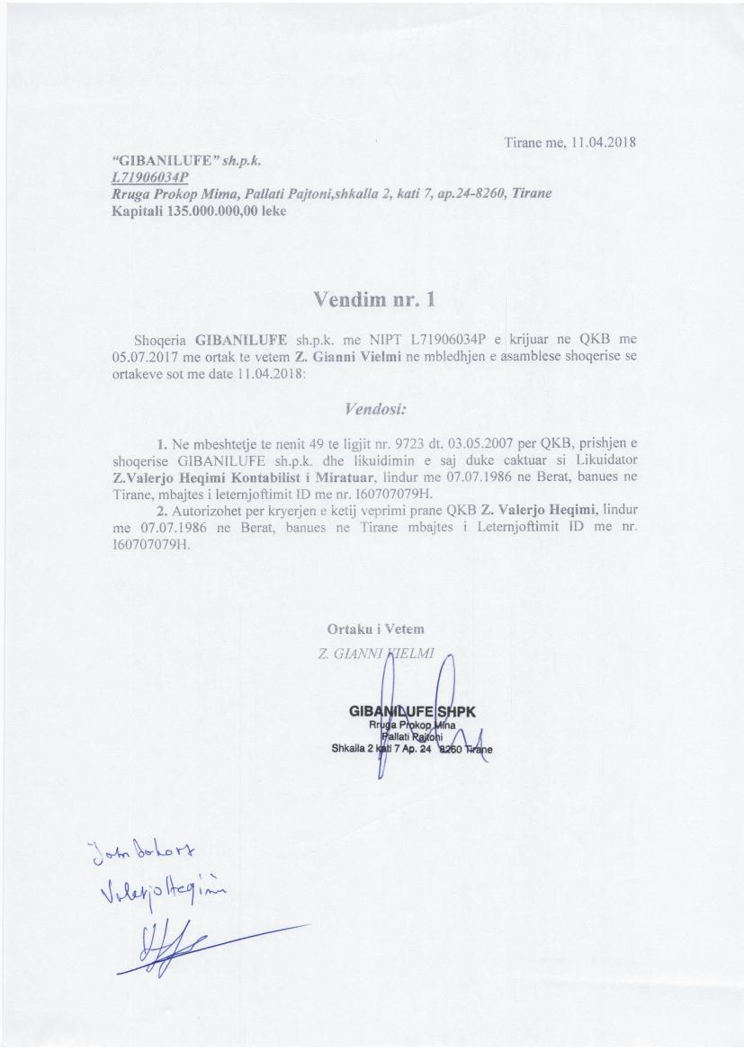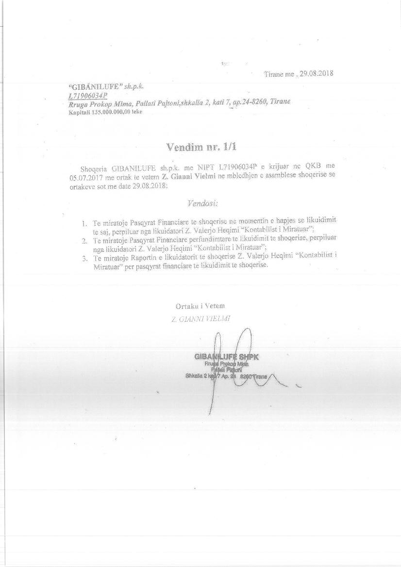 → Ekstrakt Historik i Regjistrit Tregtar, date 06.01.2023 → Akt themelimi i Shoqerise → Vendim i Ortakut te Vetem, Likuidim Shoqerie date 11.04.2018 → Vendim i Ortakut te Vetem, Çregjistrim Shoqerie date 29.08.2018 |