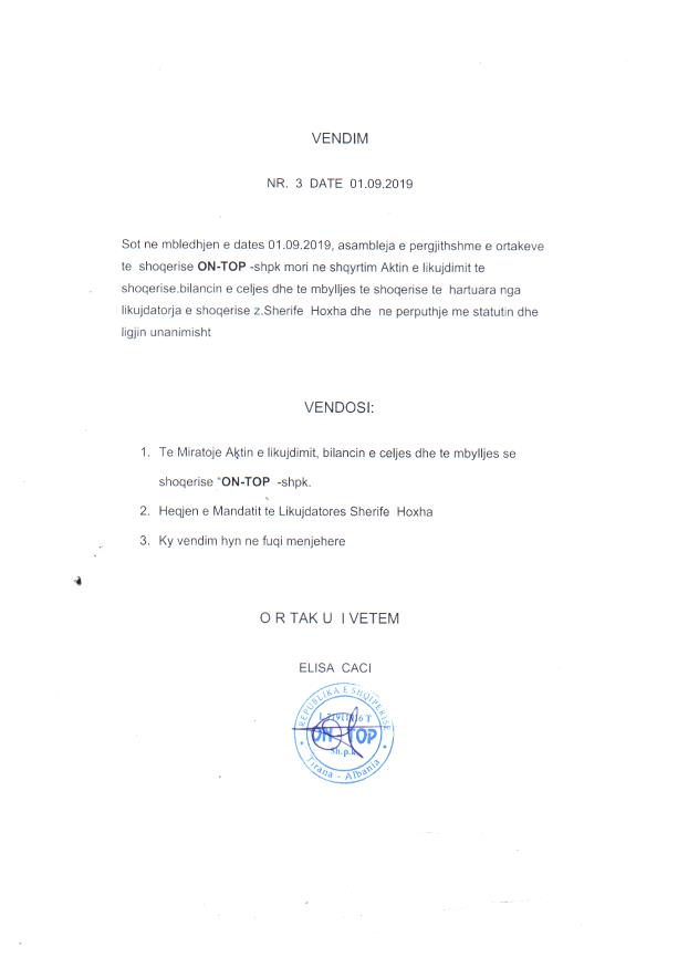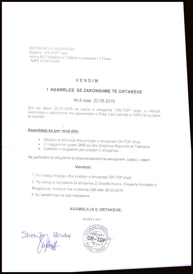 Vendim i Asamblese se Ortakeve, Likuidim Shoqerie date 22.05.2019