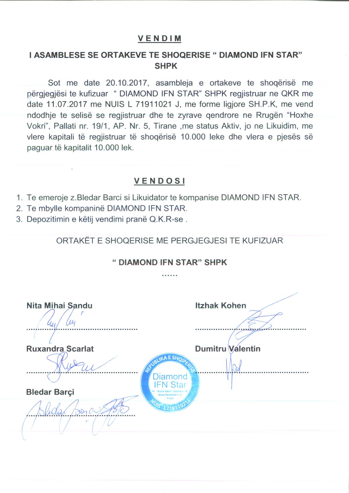 | Çështje Ligjore: | Ne daten 20.10.2017, me vendim te asamblese se ortakeve, u vendos fillimi i procedurave te likuidimit te shoqerise dhe u caktua Bledar Barçi si likuidues. |