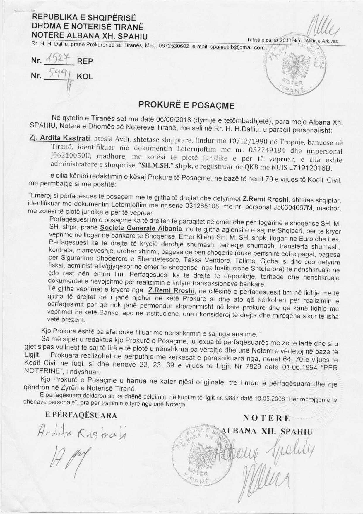 | Çështje Ligjore: | Ne daten 06.09.2018, ne baze te Prokurës së Posaçme, Nr.1527 Rep, Nr.599/1 Kol, datë 06.09.2018, emërohet si përfaqësues i posaçëm me të gjitha të drejtat dhe detyrimet Z.Remi Rroshi të paraqitet në emër dhe për llogari të shoqërisë pranë Bankës "Societe Generale Albania". |