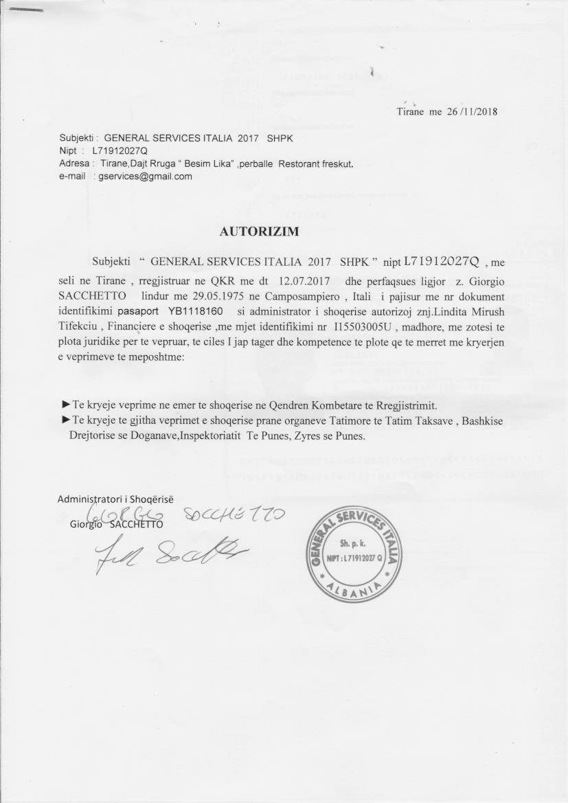 | Emërtime të tjera Tregtare: | GENERAL SERVICES ITALIA 2017 |