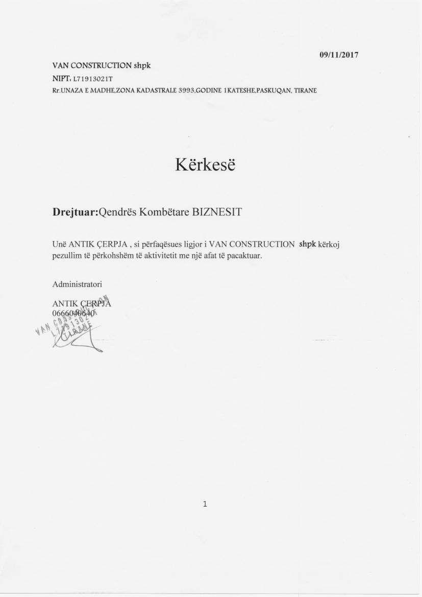 | Emërtime të tjera Tregtare: | VAN CONSTRUCTION |