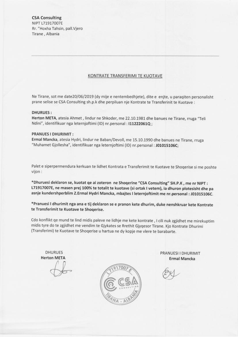 → Ekstrakt Historik i Regjistrit Tregtar, date 16.01.2023 → Akti i themelimit → Kontrate transferimi kuotash date 01.03.2018 → Kontrate transferimi te kuotave date 15.07.2020 → Kontrate transferimi kuota date 20.06.2019 → Kontrate transferimi Kuotash, date 14.12.2022 |