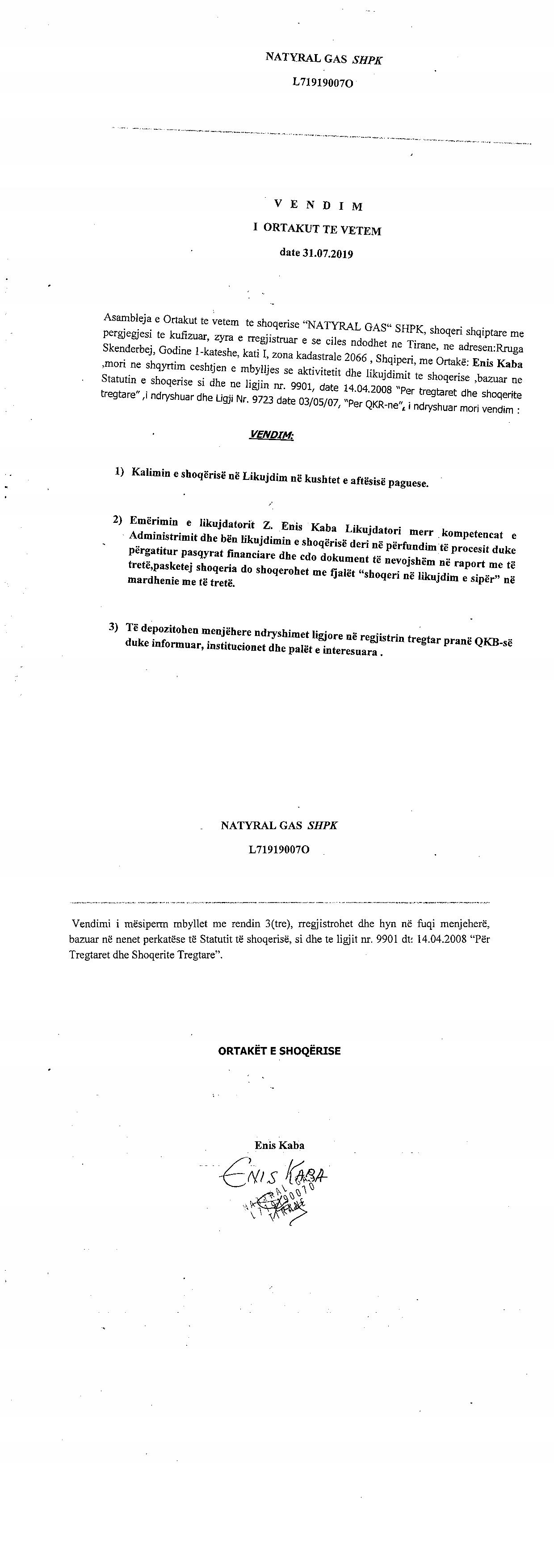 L71919007O, deri në një njoftim të dytë të përmbaruesit Gjyqësor. II. Ne daten 31.07.2019, me vendim te ortakut te vetem te shoqerise, u miratua kalimi i shoqerise ne likuidim dhe emerimin si likuidator te shoqerise Enis Kaba. Statusi i shoqerise ishte "Aktiv" u be "Shoqeri ne Likuidim e Siper". III. Ne daten 08/09/2020, ne baze te Urdhrit Nr.705/7 Prot, Nr.705 Dosje, datë 25.08.2020, "Urdhër për Vënien e Sekuestros Konservative", lëshuar nga Zyra e Përmabrimit Privat 3H, protokolluar nga QKB me Nr.7769 Prot, datë 02.09.2020, u urdherua: Qendra Kombëtare e Biznesit të bëjë bllokimin e kuotave dhe të drejtat që rrjedhin nga zotërimi i aksioneve nga subjekti "Natyral Gas" shpk me NUIS L71919007O dhe administrator Enis Kaba. |
