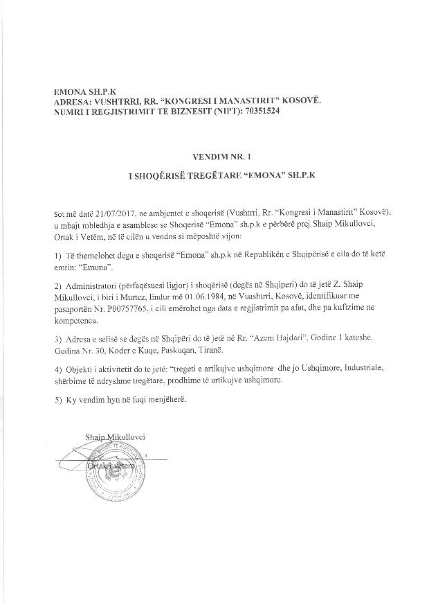 | Shoqëri e huaj për këtë subjekt: | Shoqeria “EMONA”, eshte shoqeri me pergjegjesi te kufizuar, e themeluar dhe organizuar sipas ligjeve te Kosoves, me numer biznesi 70351524, me seli Vushtrri, Ajet Gërguri, nr.42, Kosove, me perfaqesues Latif Resyli. Ortak i vetem i shoqerise eshte Shaip Mikullovci. (Sipas te dhenave per shoqerine ne ARBK) Subjekti Juridik nuk ka regjistruar të dhëna në regjistrin e pronarëve përfitues RPP deri me date 21.01.2023 |