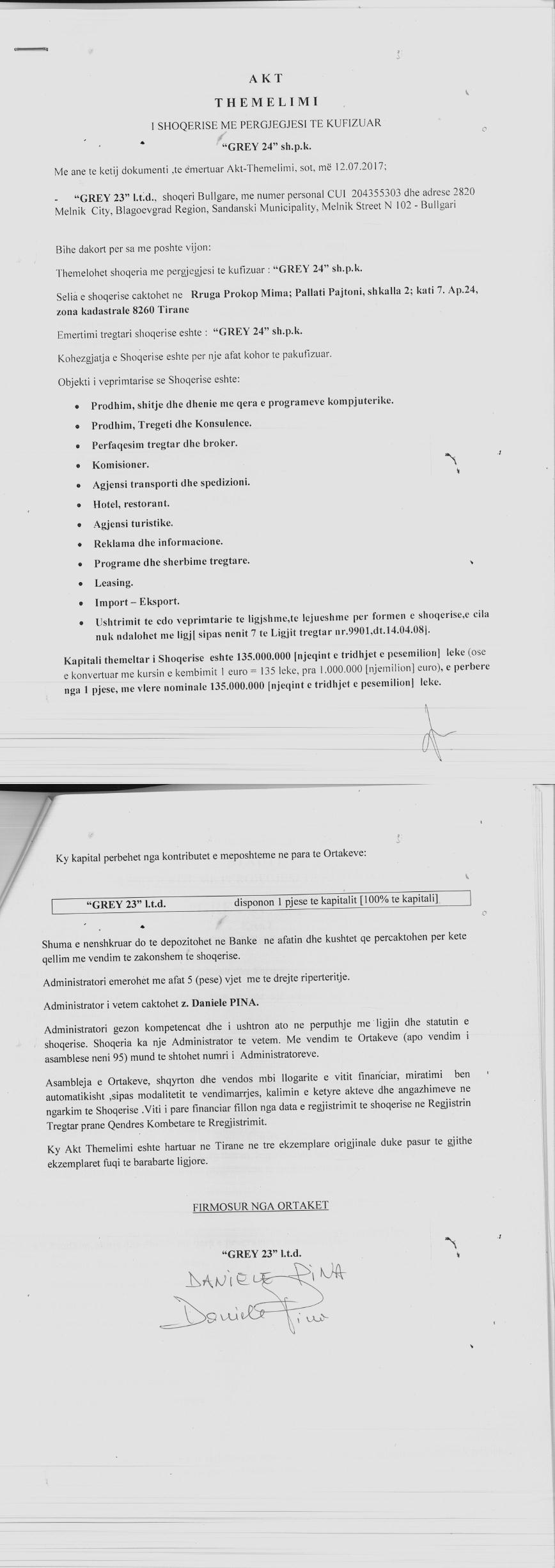 | Shoqëri Mëmë / Zotërues për këtë Subjekt: | Shoqeria “GREY 23”, eshte shoqeri me pergjegjesi te kufizuar, e themeluar dhe organizuar sipas ligjeve te Bullgarise, me numer personal CUI 204355303, me seli ne 2820 Melnik City, Blagoevgrad, Sandanski Municipality, Bullgari. (Sipas Akt themelimit te Shoqerise) Subjekti Juridik nuk ka regjistruar të dhëna në regjistrin e pronarëve përfitues RPP deri me date 21.01.2023 |