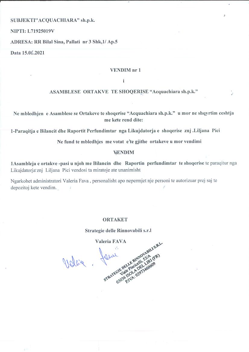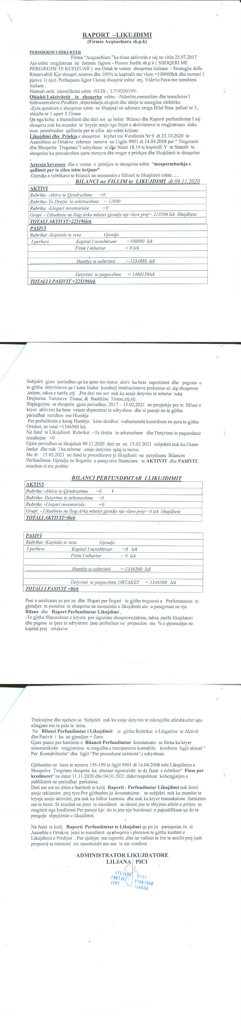| Çështje Ligjore: | I. Me date 23.10.2020, me vendim te asamblese se ortakeve, u vendos likuidimi i shoqerise per arsye te mospermbushjes se qellimit te krijimit dhe u caktua si likuidues i shoqerise Znj. Liljana Pici.