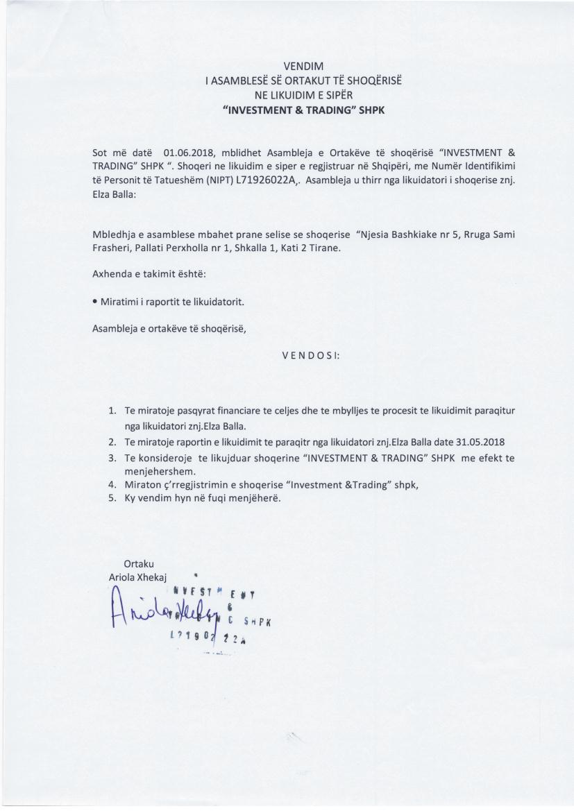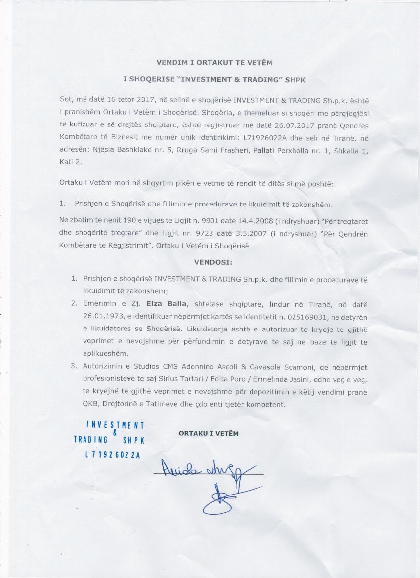 | Çështje Ligjore: | I. Me date 16.10.2017, me vendim te ortakut te vetem te shoqerise, u vendos fillimi i procedures se likuidimit dhe emerimi i Znj. Elza Balla si likuidatore.
