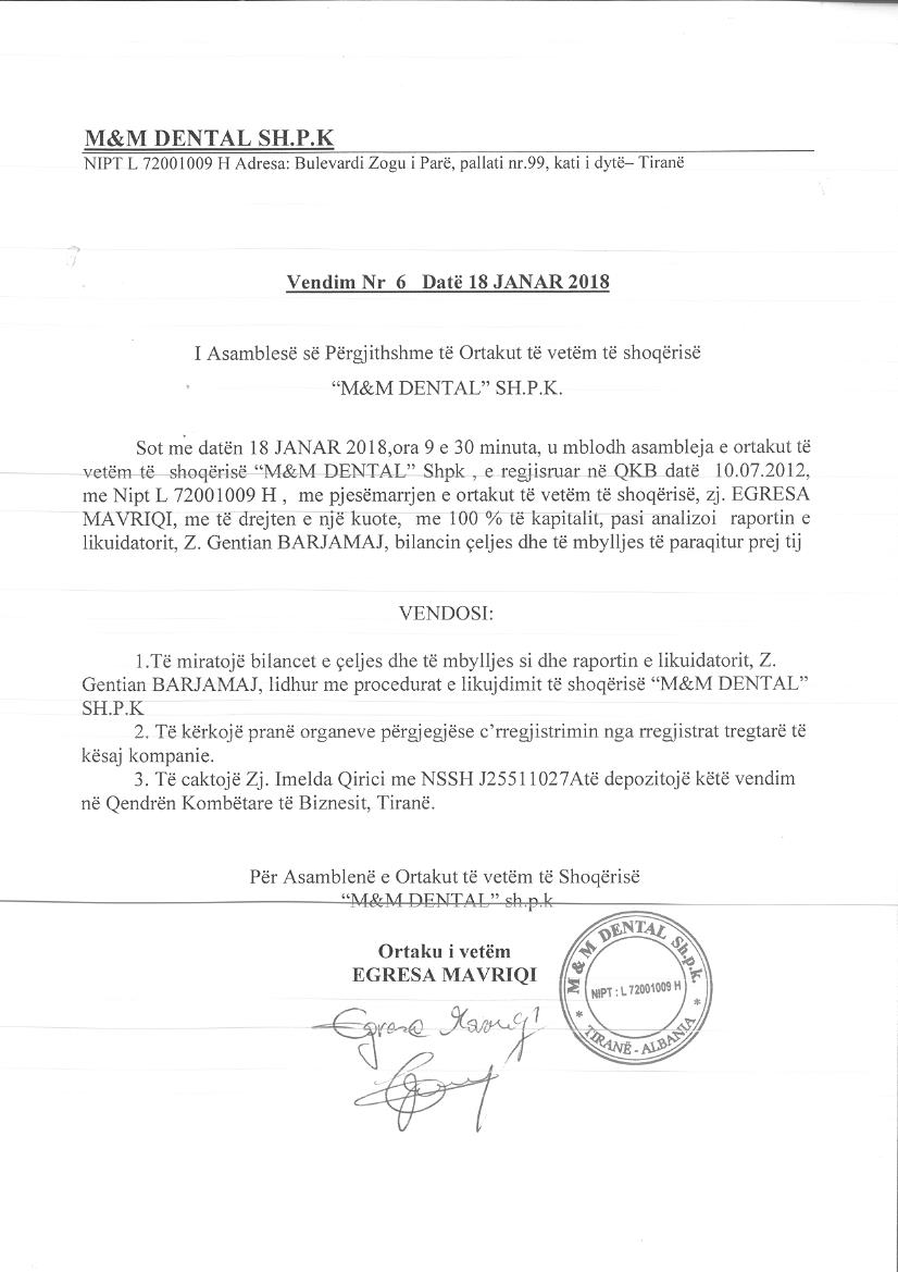 | Çështje Ligjore: | I. Me datë 25.10.2017, me vendim të asamblesë së ortakut të vetëm, u miratua prishja e shoqërisë dhe fillimi i procedurave të likuidimit. Likuidator i shoqërisë u emërua z. Gentian Barjamaj.
