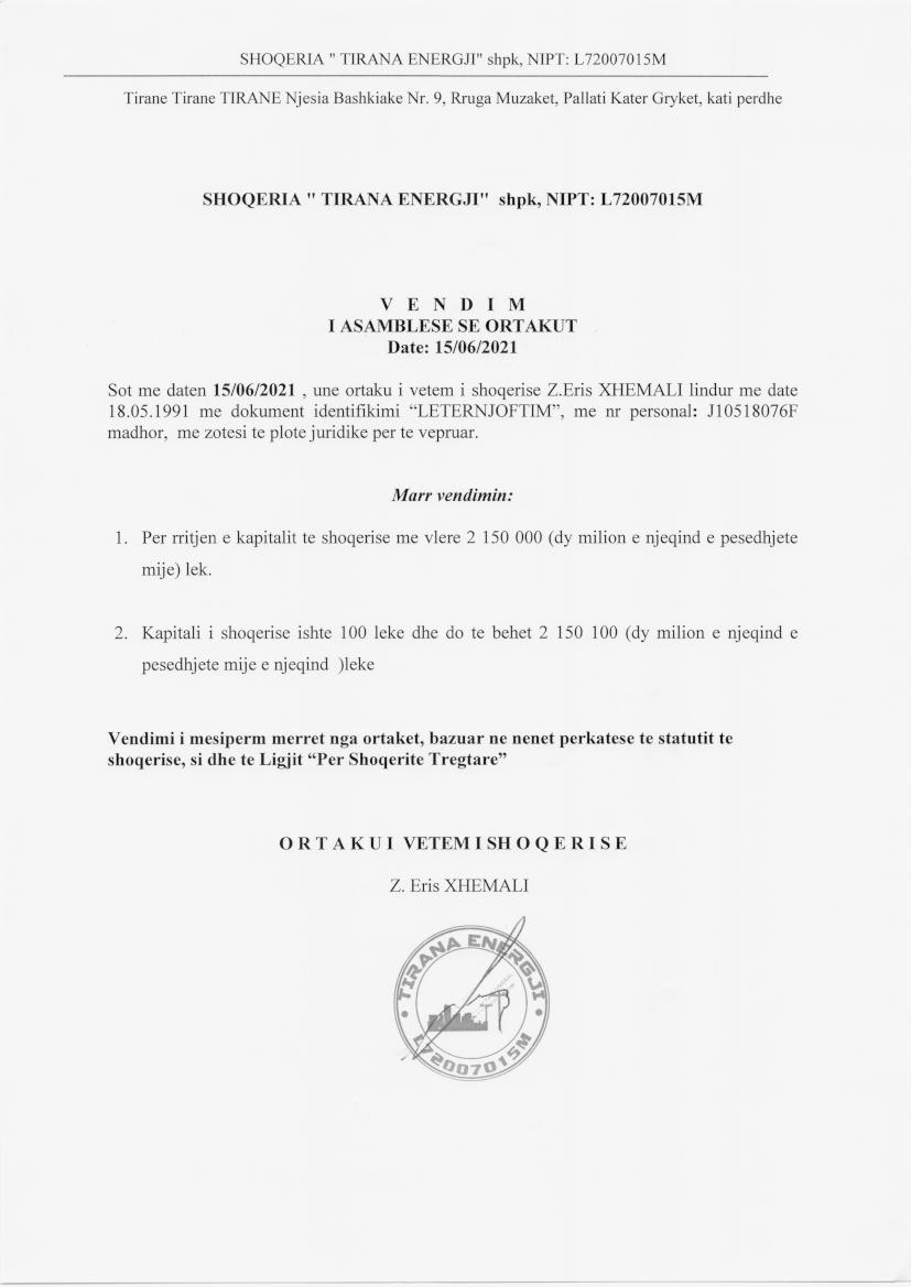 2413 Kol.me anë të së cilës subjekti shoqëria “TIRANA ENERGJI” sh.p.k., përfaqësuar nga administratori z. Eris Xhemali, caktojnë si përfaqësues z. Amadeos Latifi që të veprojë në bazë të tagrave që i lejon kjo prokurë. |