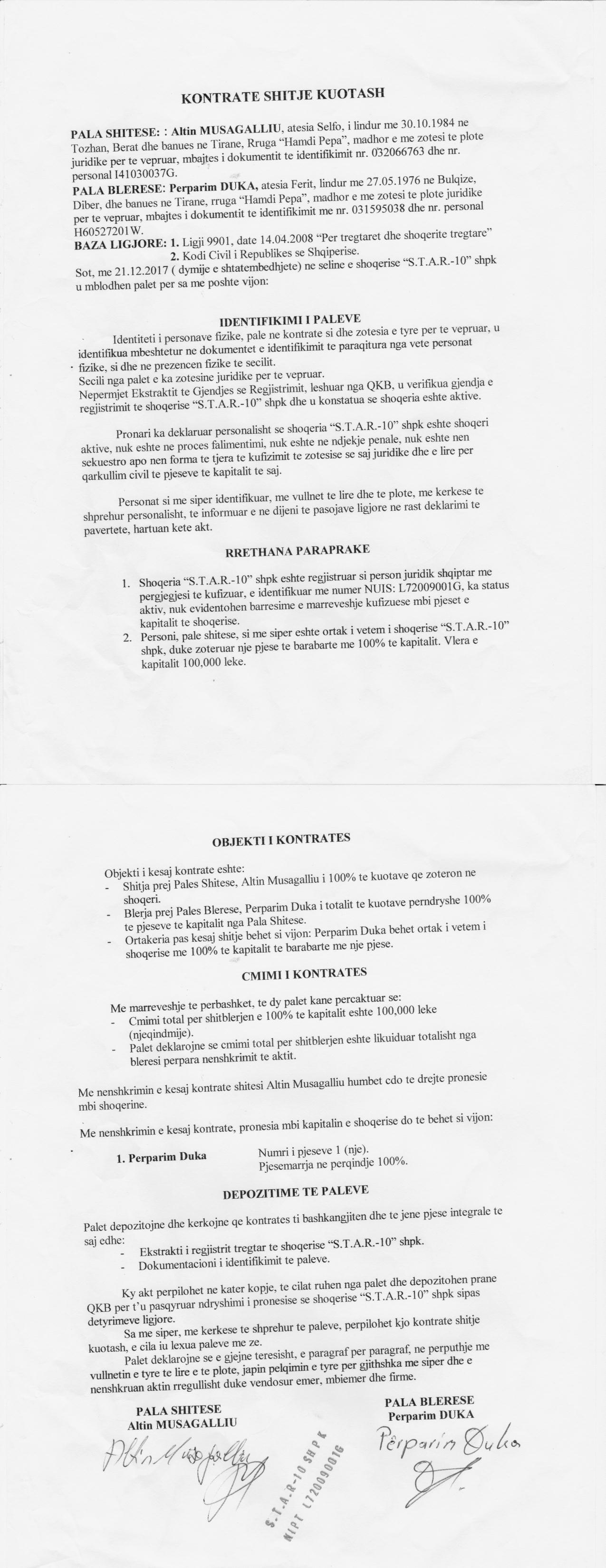 → Ekstrakt Historik i Regjistrit Tregtar date 17.10.2024 → Kontrate shitje kuotash date 07.11.2017 → Kontrate shitje kuotash date 21.12.2017 |