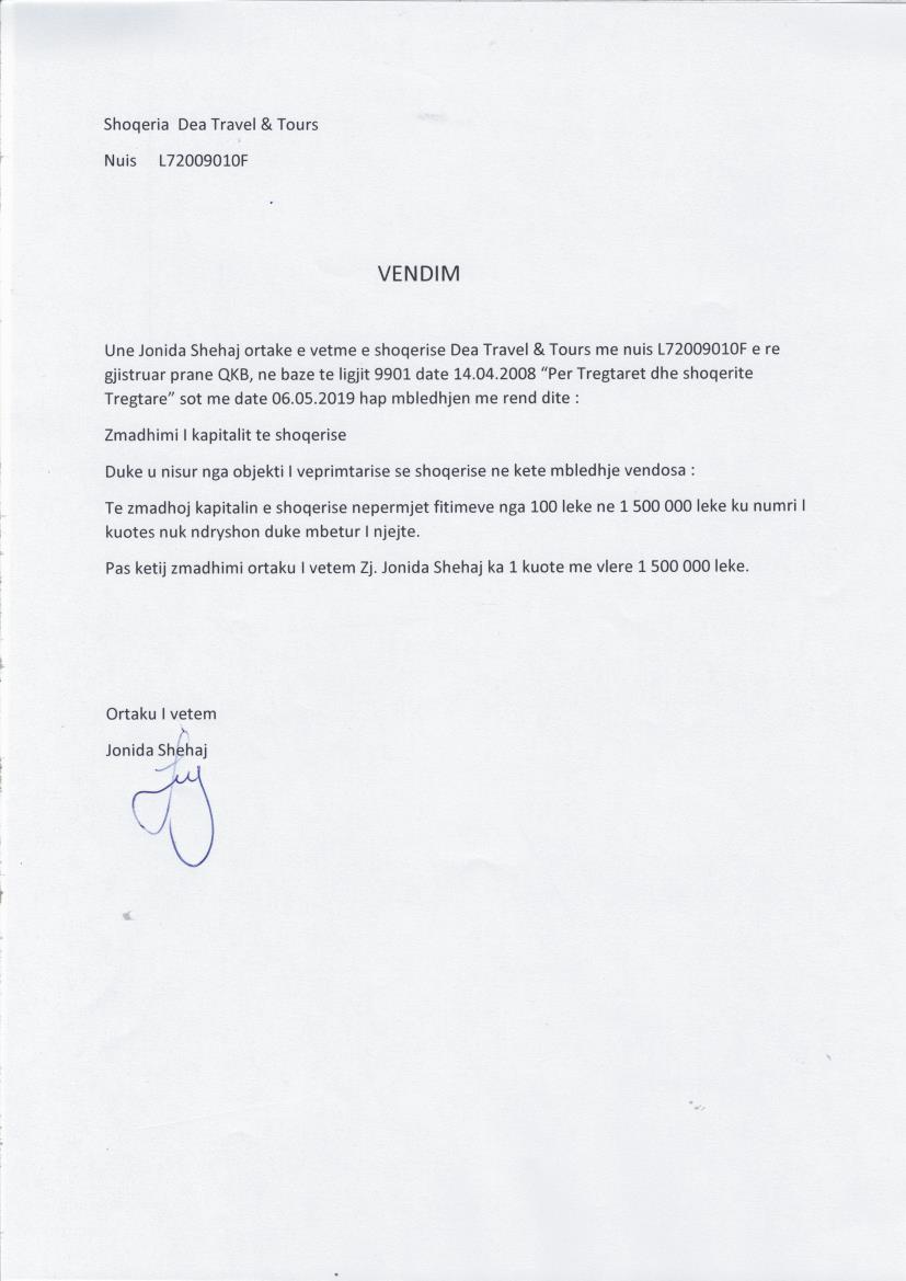 → Ekstrakt Historik i Regjistrit Tregtar date 17.10.2024 → Kontratë shitje kuotash datë 15.04.2019 → Vendim per zmadhim kapitali date 06.05.2019 |