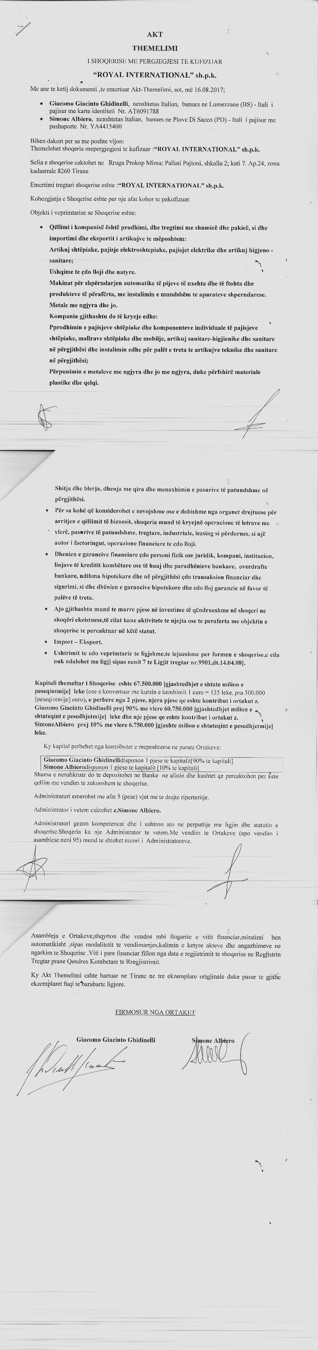 | Objekti i Veprimtarisë: | Prodhimi, dhe tregtimi me shumicë dhe pakicë, si dhe importimi dhe eksportit i artikujve te mëposhtem: Artikuj shtëpiake, pajisje elektroshtepiake, pajisjet elektrike dhe artikuj higjeno - sanitare; Ushqime te çdo lloji dhe natyre. Makinat për shpërndarjen automatike të pijeve të nxehta dhe të ftohta dhe produkteve të përafërta, me instalimin e mundshëm te aparateve shperndarese. Metale me ngjyra dhe jo. Kompania gjithashtu do të kryeje edhe: Prodhimin e pajisjeve shtëpiake dhe komponenteve individuale të pajisjeve shtëpiake, mallrave shtëpiake dhe mobilje, artikuj sanitare-higjienike dhe sanitare në përgjithësi dhe instalimin edhe për palët e treta te artikujve teknike dhe sanitare në përgjithësi; Përpunimin e metaleve me ngjyra dhe jo me ngjyra, duke përfshirë materiale plastike dhe qelqi. Shitja dhe blerja, dhenja me qira dhe menaxhimin e pasurive të patundshme në përgjithësi. Për sa kohë që konsiderohet e nevojshme ose e dobishme nga organet drejtuese për arritjen e qëllimit të biznesit, shoqeria mund të kryejnë operacione të letrave me vlerë, pasurive të patundshme, tregtare, industriale, leasing si përdorues, si një autor i factoringut, operazione financiare te cdo lloji. Dhenien e garancive financiare çdo personi fizik ose juridik, kompani, institucion, linjave të kreditit kombëtare ose të huaj dhe paradhënieve bankare, overdrafte bankare, ndihma hipotekare dhe në përgjithësi çdo transaksion financiar dhe sigurimi, si dhe dhënien e garancive hipotekore dhe cdo lloj garancie në favor të palëve të treta. Ajo gjithashtu mund te marre pjese në investime të qëndrueshme në shoqeri ne shoqëri ekzistuese,të cilat kane aktivitete te njejta ose te peraferta me objektin e shoqerise te percaktuar në këtë statut. Import – Eksport. |