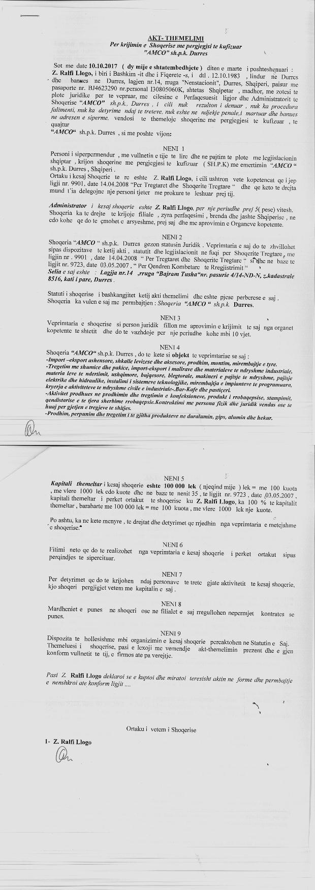 | Çështje Ligjore: | Me date 21/02/2019, me ane te Prokurës së Posaçme, me nr.rep. 743 e kol.414/2, datë 19.06.2018 me anë të cilës administratori z.Ralfi Llogo ka autorizuar z.Halil Hasa sipas tagrava të përcaktuara në këtë prokurë. |