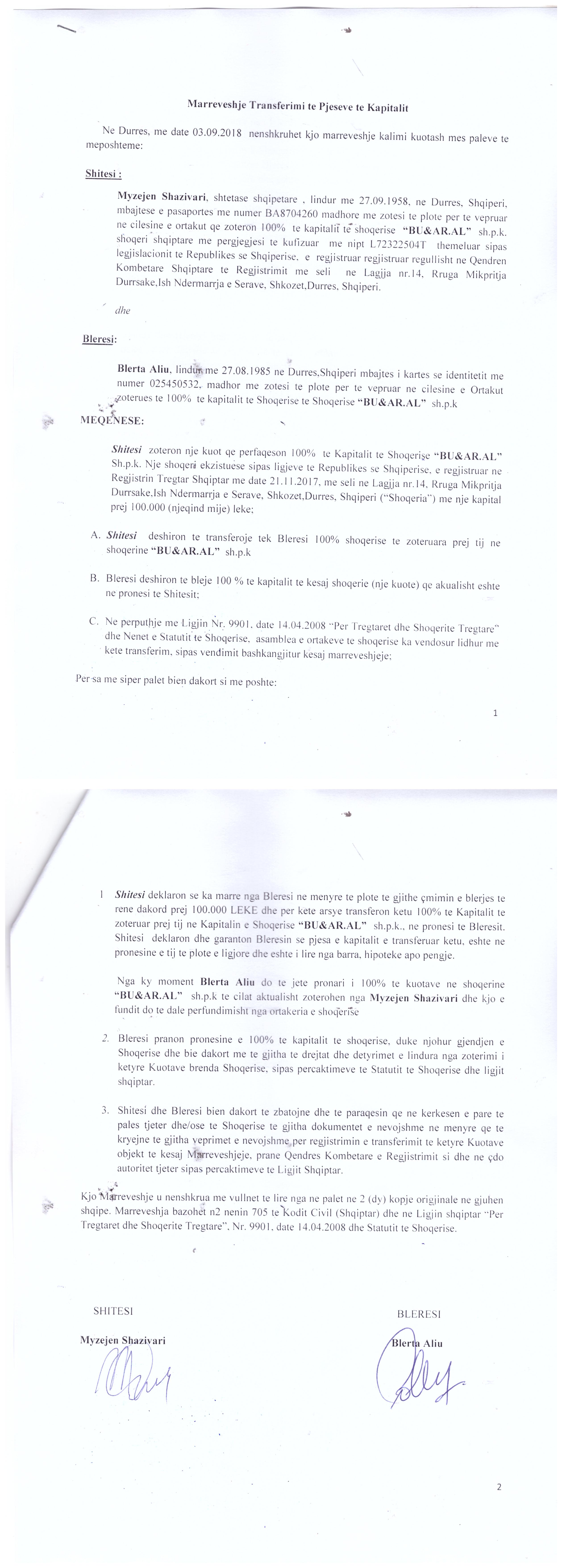 → Ekstrakt Historik i Regjistrit Tregtar date 22.05.2025 → Akt themelimi i Shoqerise → Marreveshje transferim i pjeseve te kapitalit date 03.09.2018 → Marreveshje per transferimin e kuotave date 30.05.2022 |